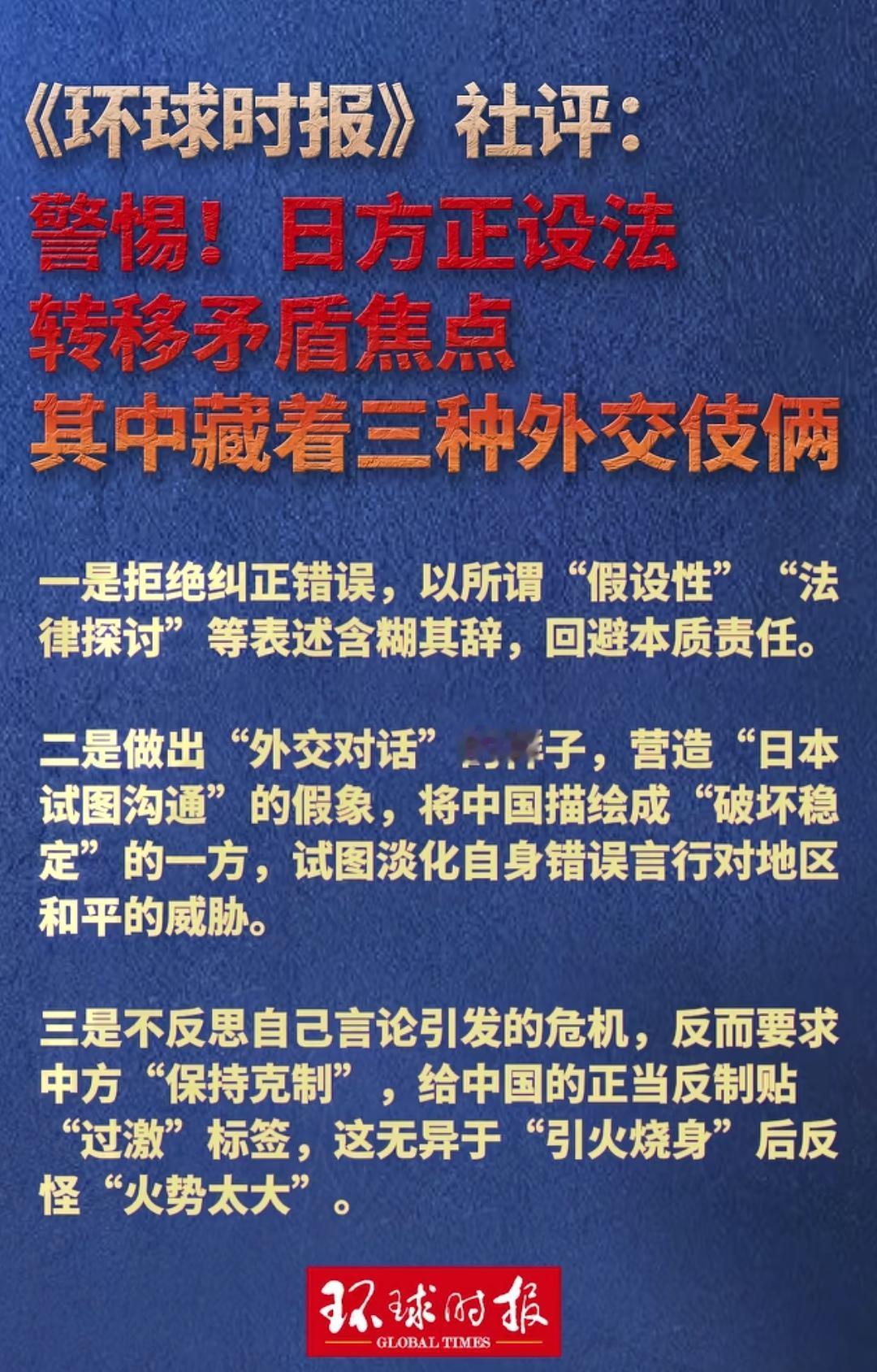 《环球时报》日方一边声称愿意对话,一边用表演弱势逃避责任,愿意对话的姿态很伪善!模糊措辞回避本质责任,拿假设性探讨当挡箭牌,假装主动沟通,反而把中国塑造成破坏稳定的一方,自己引火烧身,倒打一耙说成中方反制过激!对话得有诚意,回避责任的表演骗不了人!