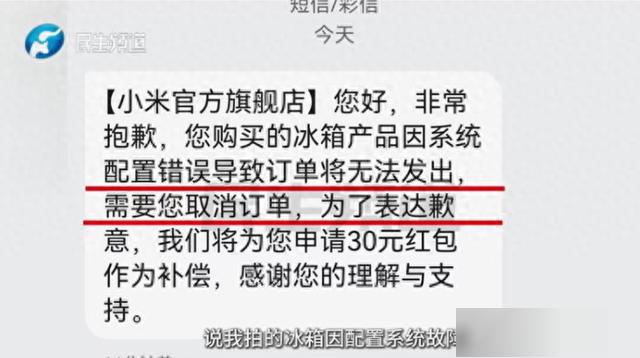 “我抢了好几天,结果等来的却是一条取消订单的短信。”河南安阳张先生向河南广播电视台民生频道《小莉帮忙》反映,他双十一期间在电商平台小米官方旗舰店秒杀到一台11.11元的小米冰箱,却在等待发货的日子里被商家以“系统配置错误”为由拒绝发货。