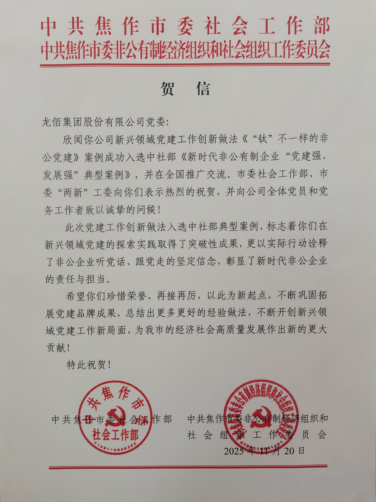 11月22日,记者从龙佰集团了解到,恰逢龙佰集团成立发展七十周年重要节点,中央社会工作部编选的《新时代非公有制企业“党建强、发展强”典型案例》正式发布,龙佰集团凭借党建与产业深度融合的实践入选。