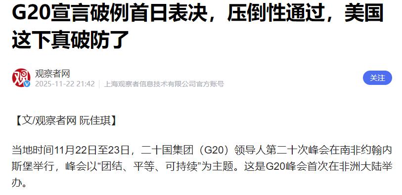 美国这下真的要破防了,没有美国的G20宣言破例首日表决,压倒性通过。不纳入美国的任何意见,G20宣言的这记重拳打的有力道。 按照以往惯例,G20宣言往往要在各国讨价还价中拖到最后一刻,甚至出现过因分歧过大无法发表联合声明的情况,但这次美国一缺席,122条内容的峰会宣言当天就顺利通过,这种效率简直像按下了快进键。 美国在会前还试图通过驻南非大使馆照会,反对“以二十国集团共识为前提发表任何峰会成果文件”,结果被南非政府直接拒绝,这种自讨没趣的操作,反倒成了各国加速达成共识的催化剂。 回顾过去几年的G20峰会,美国的“霸权式干扰”几乎成了宣言难产的代名词。 2020年沙特峰会时,就因为美国对疫情援助条款中的多边合作表述不满,硬生生把宣言表决拖到闭幕前最后一小时;2023年印度峰会上,又在能源转型目标上坚持要加入“化石能源过渡期”的模糊表述,导致各国在关键议题上僵持不下。 而这次峰会聚焦的债务可持续性、可再生能源装机目标、关键矿产框架等议题,放在往年大概率会被美国以“不符合自身利益”为由挑刺。 比如关于中低收入国家债务重组的《二十国集团关于债务可持续性的部长级宣言》,此前美国一直对多边债务重组机制持消极态度,如今没有了它的阻挠,这份为脆弱国家提供债务缓解路径的文件顺利纳入最终宣言。 值得玩味的是,本次宣言中提到的“到2030年全球可再生能源装机容量增至三倍”“加强发展中国家在国际金融机构决策中的话语权”等内容,都是过去美国要么淡化处理、要么直接反对的议题。 非洲大陆超过6亿人缺乏电力供应的现状,美国以往很少在G20框架下主动提及,而这次峰会不仅将能源可及性列为重点,还专门启动了“2025—2030年二十国集团财金渠道非洲合作框架”。 这种转变并非各国突然改变立场,而是少了美国这个“多边合作绊脚石”后,原本就存在的共识自然浮出水面。 中国社科院研究员朱伟东说得很到位,美国这次是“聪明反被聪明误”,它的缺席反而让与会成员更清晰地认识到单边主义的弊端,进而凝聚起坚持多边合作的共识。 从峰会成果来看,122条宣言内容涵盖了全球经济、气候变化、粮食安全、人工智能治理等多个领域,甚至还触及了联合国安理会改革这一敏感议题,这些内容能在一天内达成一致,足以说明没有美国的干扰,G20成员在应对共同挑战上的目标其实高度契合。 美国总想着用霸权维持自己在国际事务中的“特殊地位”,动辄对不符合自身利益的共识文件说不,却忘了G20的本质是多边合作平台。 这次峰会用“首日通过宣言”的事实证明,当个别国家不再把自身霸权凌驾于集体利益之上时,国际社会解决全球性问题的效率会有多高。 下一届G20峰会将由美国主办,不知道这次被“打脸”后,它会不会收敛一下单边主义作风,要是明年还想搞“一言堂”,恐怕只会遭到更多国家的抵制。