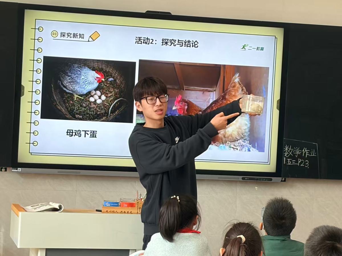 侯梦冉老师执教的科学课《鸡与鸟类》,围绕“直观感知、循序渐进”的理念,设计了“观察特征—探究习性—归纳类别”递进式任务,实现认知建构与思维提升的融合。课堂先聚焦小鸡,引导学生观察外形特点,了解其生存习性,通过具象认知夯实基础。随后过渡到小鸟知识讲解,着重梳理鸡与鸟类的共性特征,明确鸡属于鸟类且同为卵生动物,帮助学生建立类别概念,让科学知识学习循序渐进,兼顾直观体验与逻辑归纳。