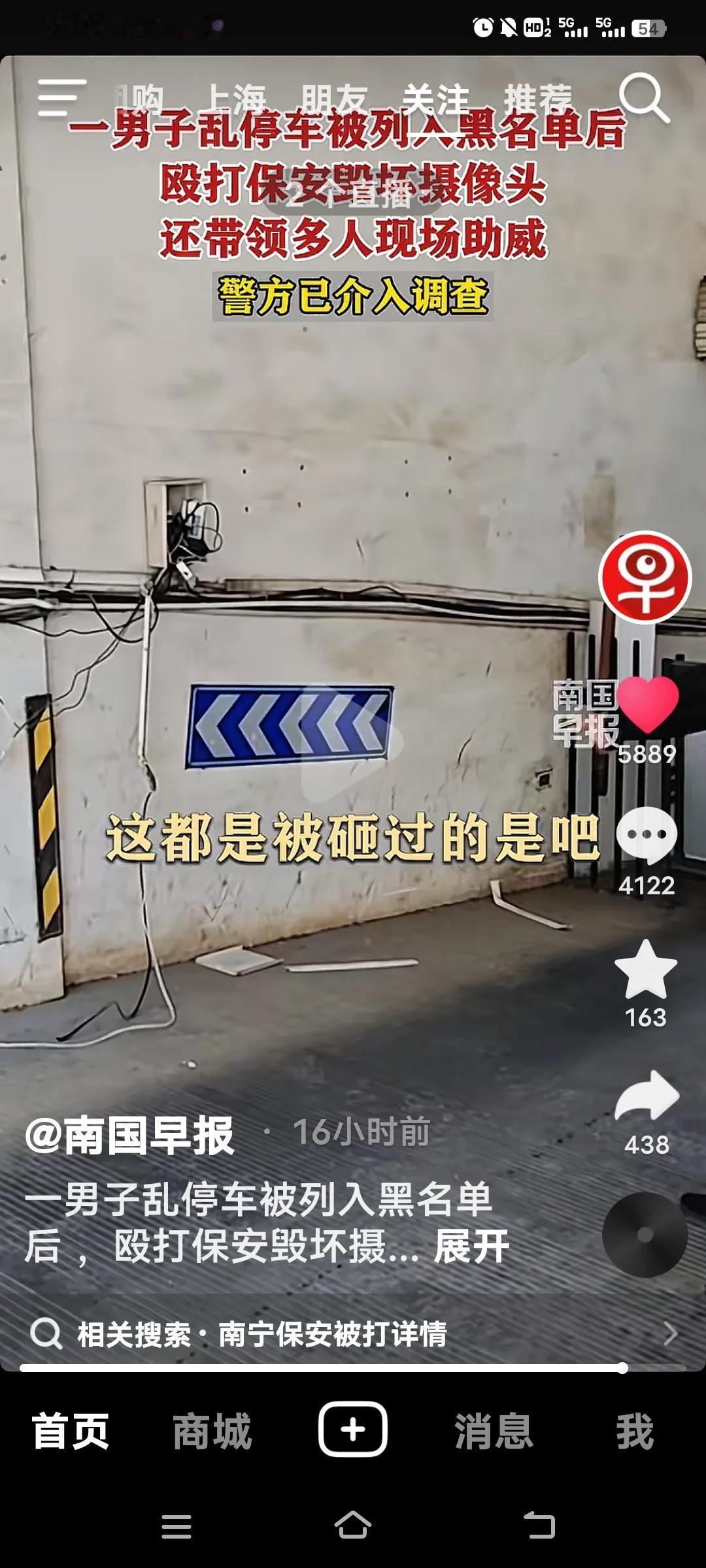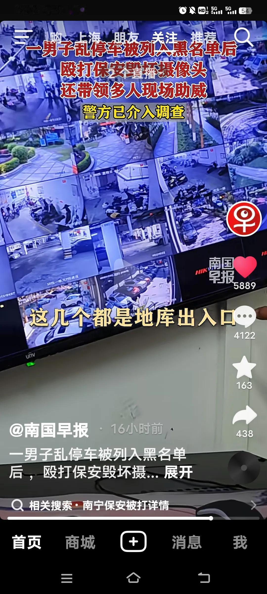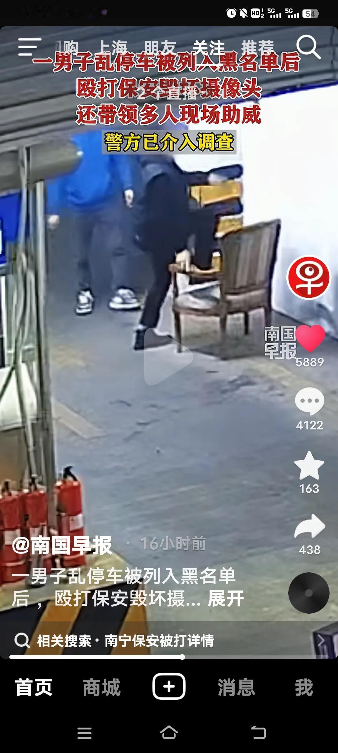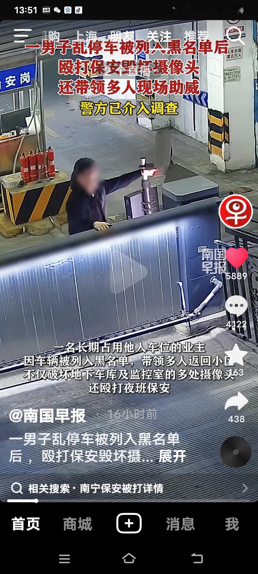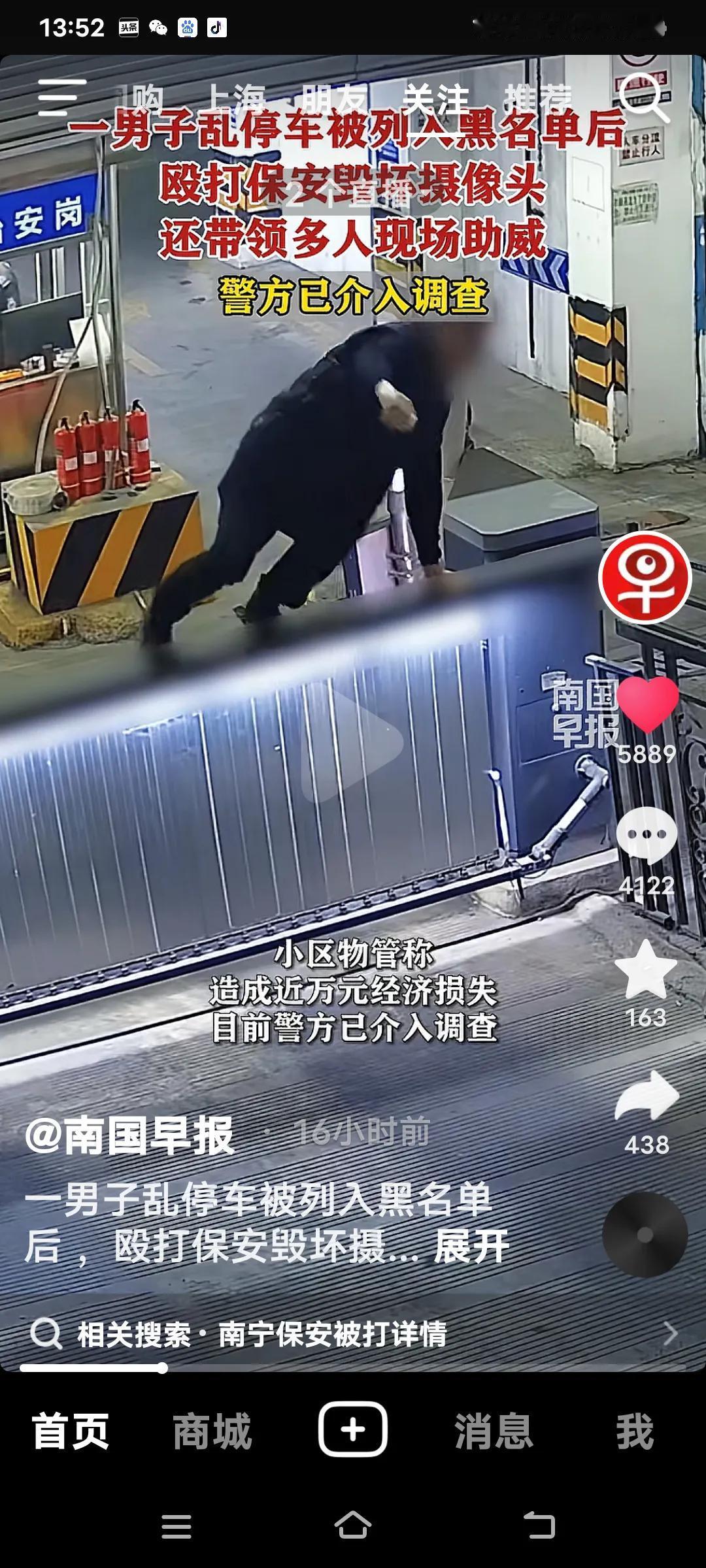 如今有些人的脾气可真是大得离谱!在南宁市江南大道旁的红日江景小区地下车库,11月22日晚,一名男子因乱停车被列入黑名单,竟对保安大打出手,还毁坏摄像头,砸了不少东西,甚至叫了一群人来现场助威。 这种行为实在恶劣至极!保安不过是在履行职责,维护小区的正常秩序,可他倒好,直接诉诸暴力。他难道不知道这已经触犯法律了吗? 目前,警方已经介入调查。有网友在评论区留言,那些协助闹事的人,当时可能还觉得挺痛快,现在估计要后悔得哭了,损坏财物价值一万以上可是要被刑拘的,大家看法不一。 说到底,这些人实在不该如此。年纪轻轻的,干嘛要知法犯法,还跟着他一起打砸呢?他们本应制止他的冲动行为!其他地方也有类似案例,最终不都受到了法律的制裁吗!男业主打保安