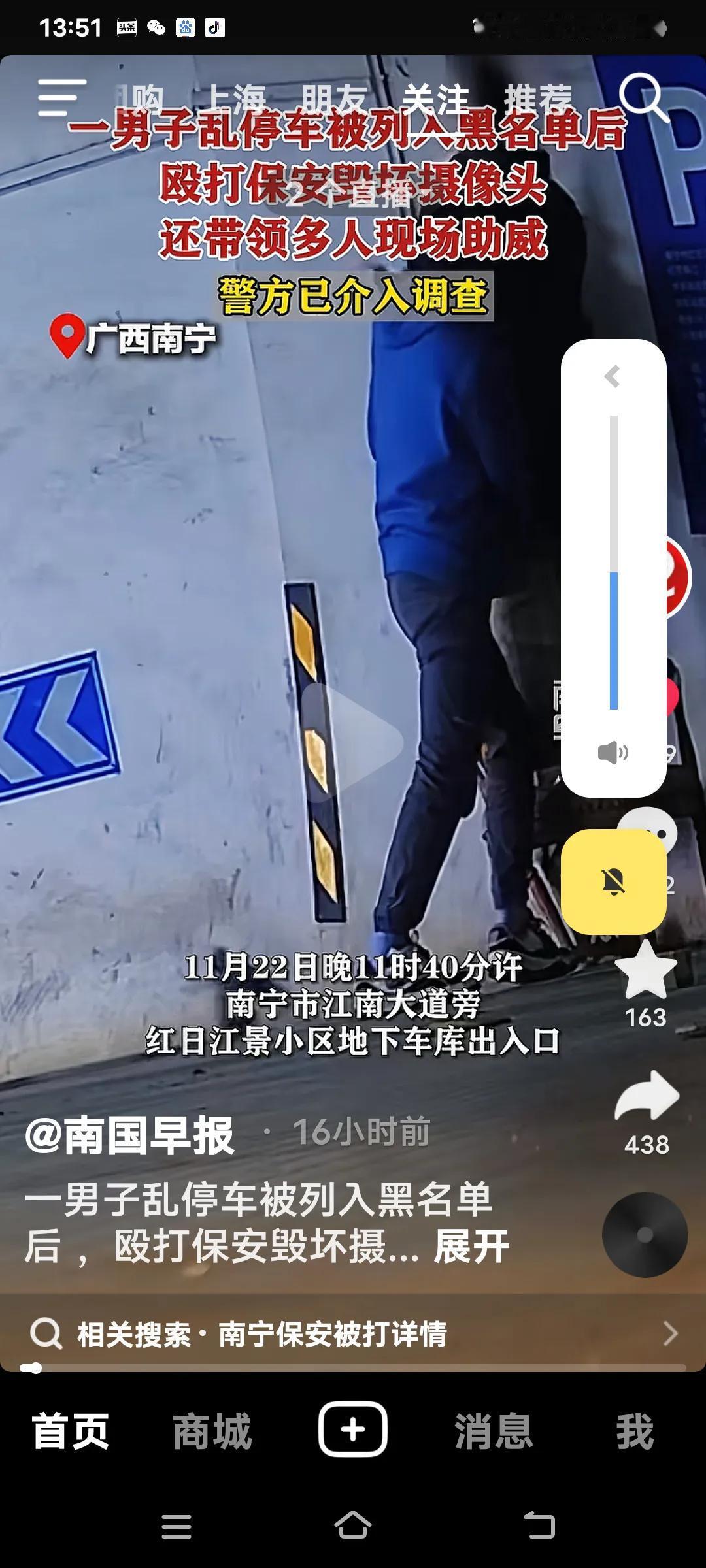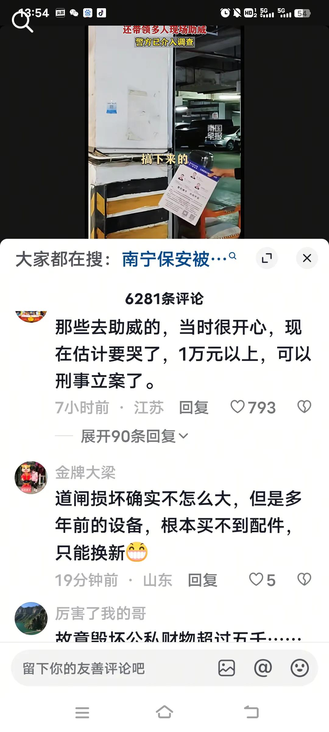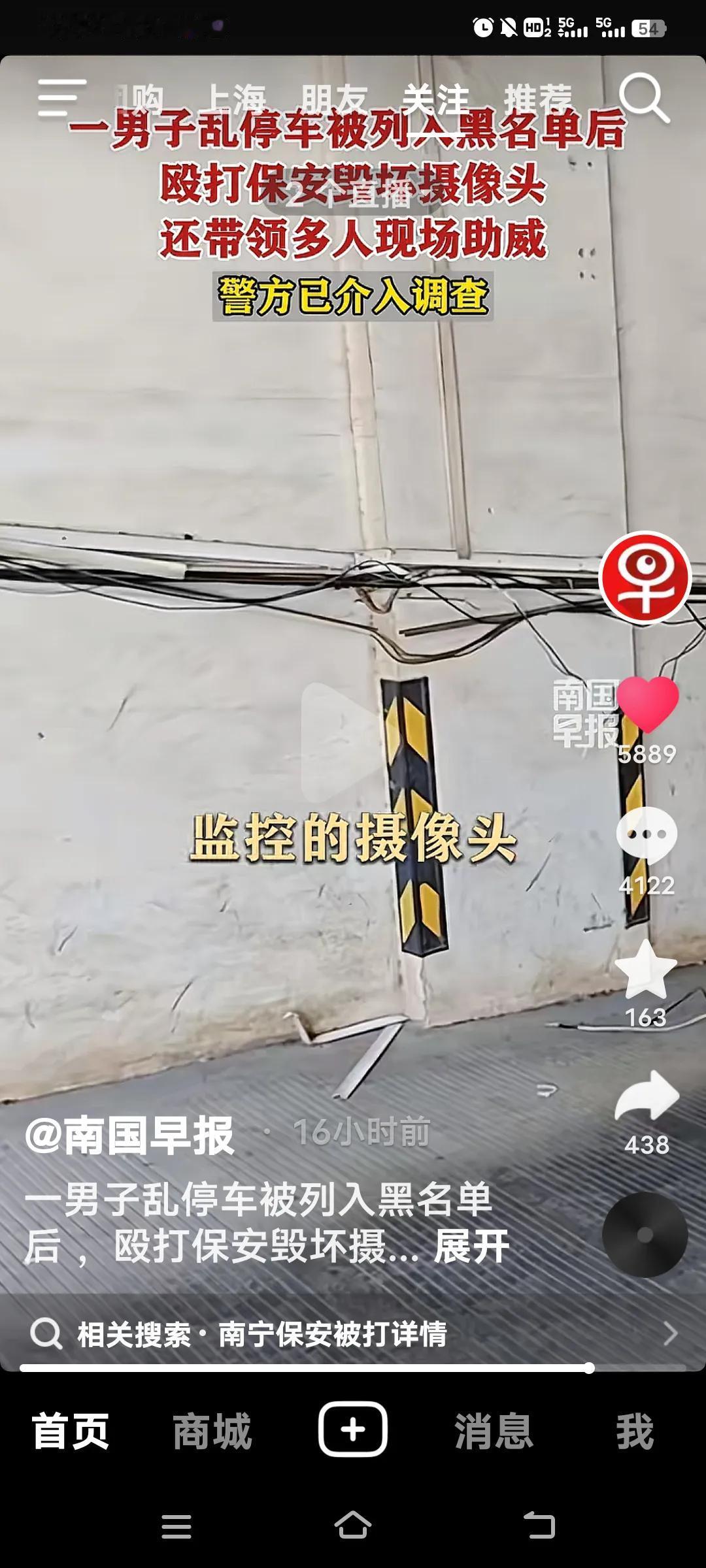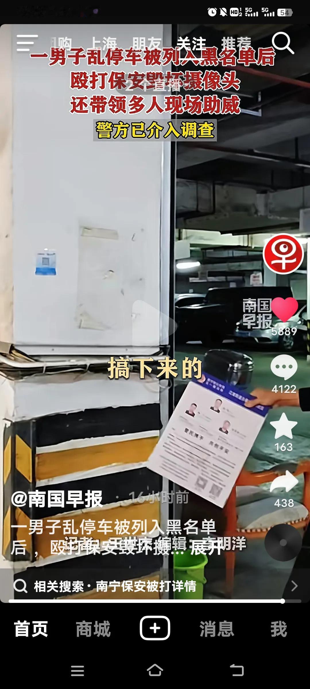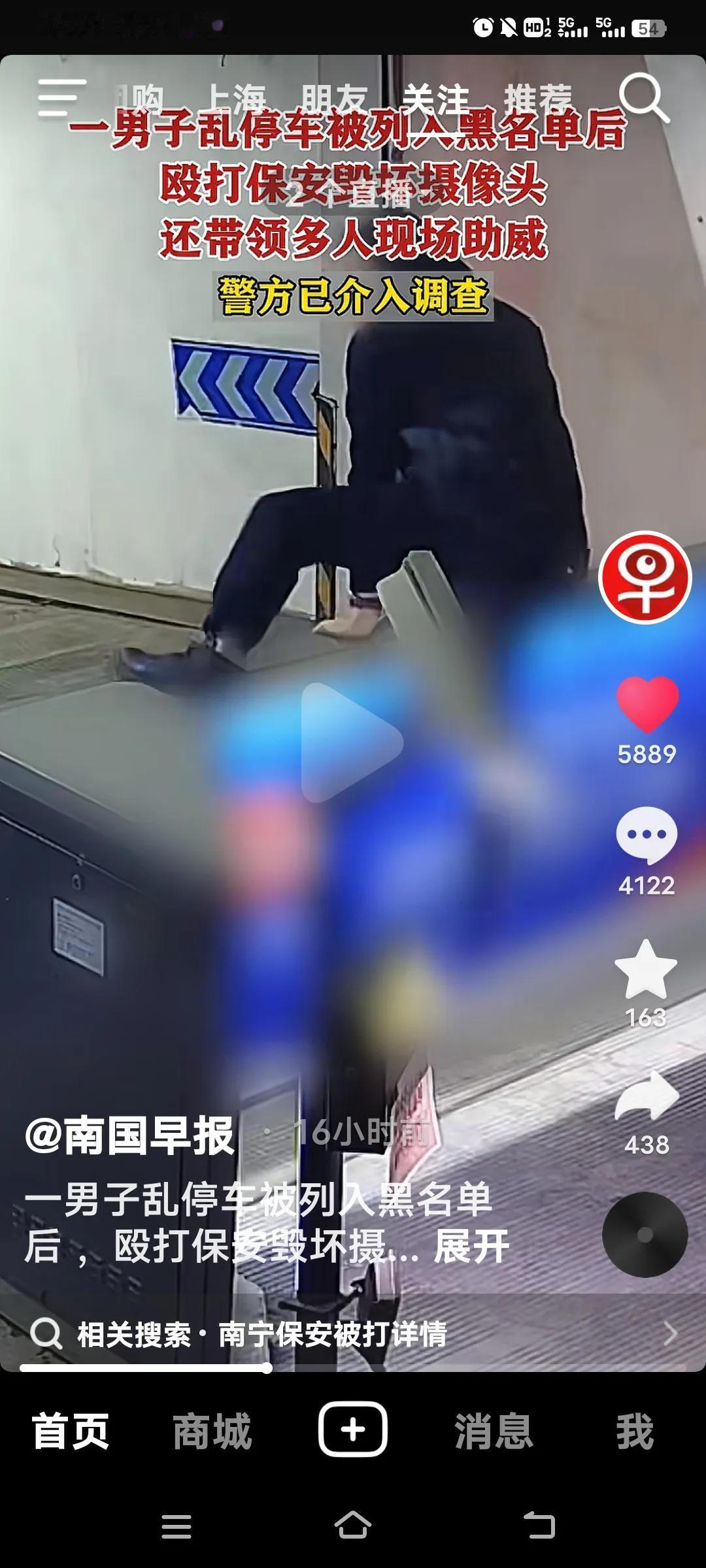 如今有些人的脾气可真是大得离谱!在南宁市江南大道旁的红日江景小区地下车库,11月22日晚,一名男子因乱停车被列入黑名单,竟对保安大打出手,还毁坏摄像头,砸了不少东西,甚至叫了一群人来现场助威。 这种行为实在恶劣至极!保安不过是在履行职责,维护小区的正常秩序,可他倒好,直接诉诸暴力。他难道不知道这已经触犯法律了吗? 目前,警方已经介入调查。有网友在评论区留言,那些协助闹事的人,当时可能还觉得挺痛快,现在估计要后悔得哭了,损坏财物价值一万以上可是要被刑拘的,大家看法不一。 说到底,这些人实在不该如此。年纪轻轻的,干嘛要知法犯法,还跟着他一起打砸呢?他们本应制止他的冲动行为!其他地方也有类似案例,最终不都受到了法律的制裁吗!男业主打保安
