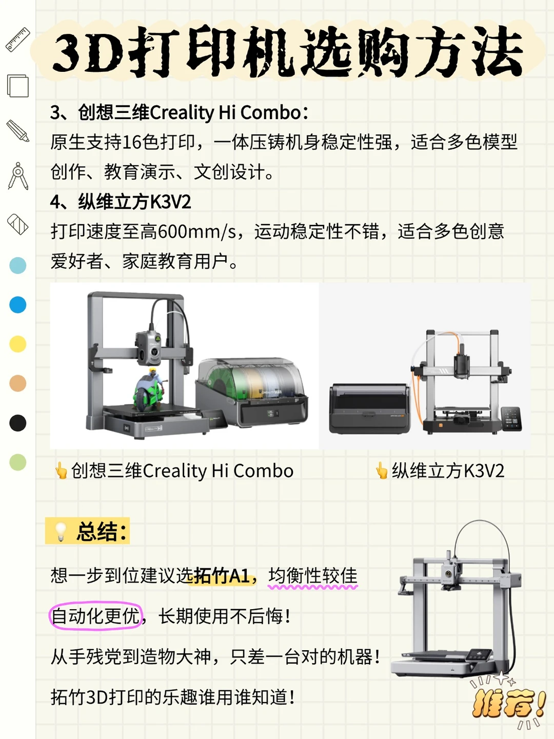 打印速度至高600mm/s,运动稳定性不错,适合多色创意爱好者、教育演示。