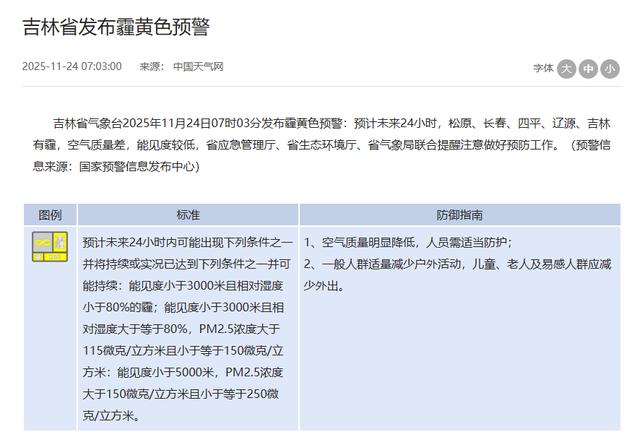 随后,吉林省气象台2025年11月24日07时03分发布霾黄色预警:预计未来24小时,松原、长春、四平、辽源、吉林有霾,空气质量差,能见度较低,省应急管理厅、省生态环境厅、省气象局联合提醒注意做好预防工作。