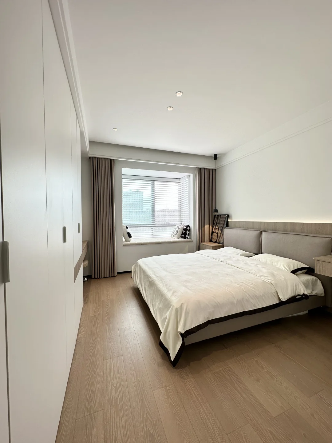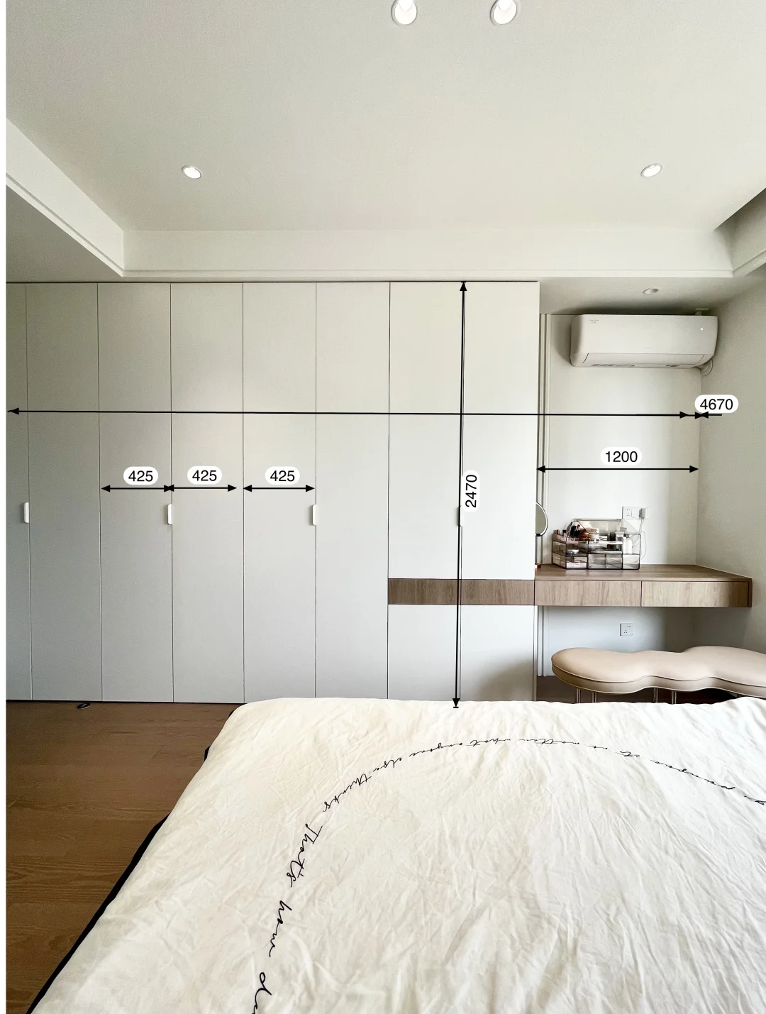 还好当初没听老公的做L型衣帽间,入住两年多了,床尾衣柜真的是实用又显空间大,衣柜空间也增加了一倍,卧室放了一张1.8*2m的床,做了床尾衣柜之后床尾过道还有90cm,很宽敞,真的太爽啦![派对R] . 各种详细尺寸供参考!衣柜尺寸在图5️⃣!👇 主卧开间3.7米,宽4.7米 护墙板高度:115cm 厚度1.8cm 护墙板离墙 5cm 床头高度:100cm 床头柜长度:52cm 宽度:45cm 高:18.5cm 离地:42cm 板材:W1000+h1377