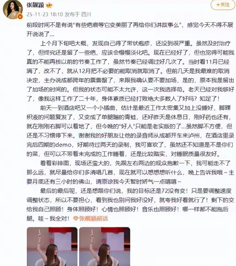 又一位女明星身体欠佳! 张靓颖自曝前一阵子患带状疱疹,已经康复但留下疤痕! 但据知情人说,张靓颖虽然只有41岁,身体素质一向不好,经常不是咳嗽就是感冒,这一类的身体免疫力低,遇到一点情况就容易生病。 以往了解,带状疱疹一般是年过50岁的人才容易得,没想到张靓颖这才41岁,也中招了呀!