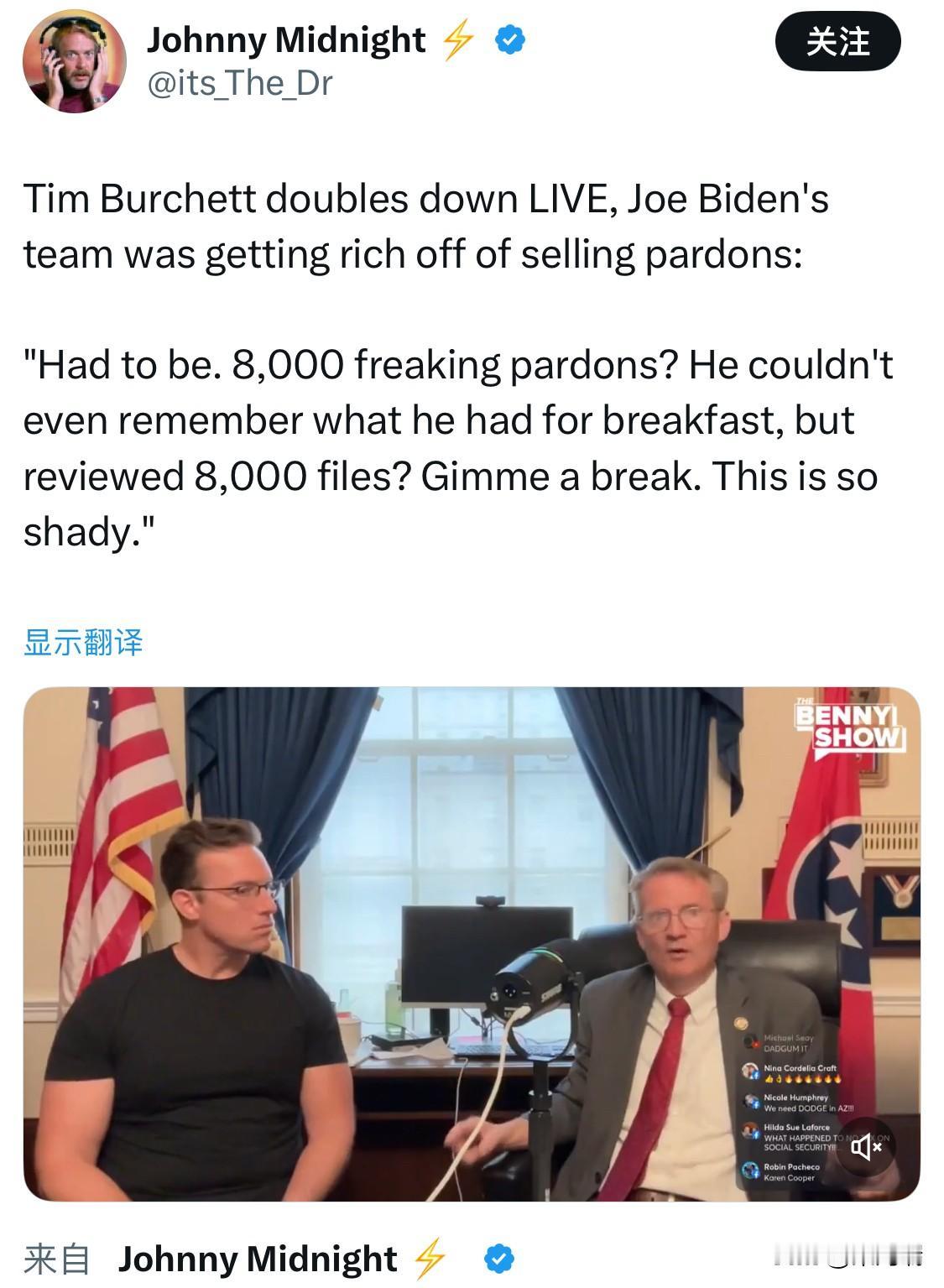太夸张了! 川普总统刚转发了众议员 蒂姆·伯切特(Tim Burchett )的重磅爆料:拜登政府出售特赦,而所谓的“NGO”资金则被倒灌回政客口袋。 蒂姆·伯切特说: “肯定有猫腻![…] 八千个特赦?拜登连自己早餐吃了什么都记不住!连厕所在哪都想不起来!结果他居然审查了八千份特赦文件?别逗我了!” “阿富汗那边有将近一千家 (非政府组织)NGO……他们告诉我们,美国政府已经给它们差不多 50 亿美元,而且还在继续,因为钱都流进 NGO 里去了!” “民主党人拼命反对我们在法案里加入对 NGO 的管控。为什么?因为那一千家 NGO 的钱,你们心里清楚得很,最终都会流回华盛顿!” 川普总统今晚连发重磅消息,难道对这些卖美贼的烂账,要开始清算了吗?