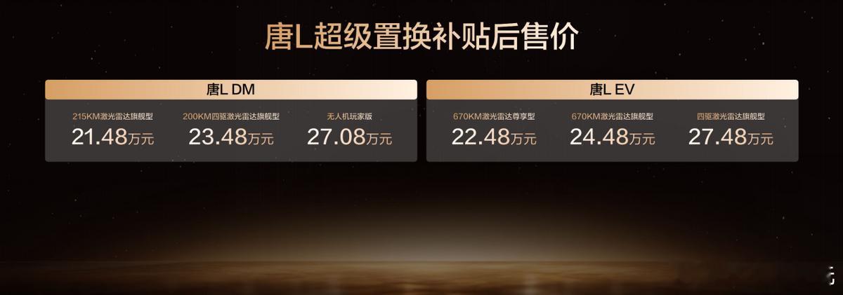 11月21日,比亚迪划时代旗舰车型汉L唐L携新车色及OTA正式发布。其中,汉L EV、唐L EV搭载超级e平台全域千伏架构,以“兆瓦闪充 油电同速”,彻底终结纯电补能焦虑;汉L DM、唐L DM标配第五代DM技术,兼顾超强性能与超级效能。此次,汉L唐L全新解锁“车位到车位”领航辅助功能,并带来全新车色、智慧生态与安全配置的全面升级!此次,汉L EV 3款车型,超级置换补贴后售价20.48万~26.48万元;汉L DM 3款车型,超级置换补贴后售价19.48万~24.48万元;唐L EV 3款车型,超级置换补贴后售价22.48万~27.48万元;唐L DM 3款车型,超级置换补贴后售价21.48万~27.08万元。同时,比亚迪还为用户准备了包含置换补贴在内的至高价值5.2万元(汉L)/4.5万元(唐L)尊享礼遇。(以上权益截至12月31日)汉L EV、唐L EV全系标配超级e平台,创造了16项全球第一!其搭载全球首个量产乘用车全域千伏高压架构,配备闪充电池、3万转电机。其中,汉L EV、唐L EV峰值充电功率高达1000kW,仅需5分钟即可补充400公里续航,相当于喝一杯咖啡的时间就能满足绝大多数城市用户一周的通勤需求!动力性能上,其单电机功率高达580kW,四驱版本总马力达1102匹,零百加速分别仅需2.7秒和3.6秒,极速也分别达到了305km/h和287km/h,打破纯电性能天花板!凭借卓越充电、性能表现,这一套动力系统荣获“中国心”2025年度十佳新能源汽车动力系统大奖。混动版本同样出色,汉L DM、唐L DM搭载第五代DM技术,包含DM-p王者混动、DM-i超级混动。数据上,汉L DM零百加速最快3.9s,亏电油耗最低仅3.9L/100km;唐L DM零百加速仅需4.3秒,百公里亏电油耗最低仅4.9L!汉L唐L更坐拥至高215km纯电续航、1430km综合续航,真正实现全场景的能耗最优、动力最佳,让鱼和熊掌可以兼得!设计层面,汉L唐L以Loong Face龙颜美学造就中国人血脉里的高级感,视觉效果极富年轻化、运动感。为满足用户对个性化的进阶追求,汉L唐L共同推出橄榄绿全新车色,汉L额外加入西子蓝新色,将东方美学与现代制造工艺完美融合。其中,橄榄绿采用低饱和度、高反射金属漆面,通过纳米级高透色浆与微米级超细铝粉的精密配比,呈现出绿中透金的渐变效果。在阳光下呈现清新明亮的视觉效果,而在室内则转为深邃墨绿,完美契合当代精英“于静谧中蕴藏活力”的生活态度。汉L独有的西子蓝创新引入巴斯夫珠光包覆型铝粉,在强光下呈现高饱和度珠光金属白,弱光时切换为低饱和度清澈碧蓝,生动还原西湖“淡妆浓抹总相宜”的诗意美感。此外,汉L专为个性用户打造了黑化运动套件,包含悬浮黑顶、黑化车窗饰条等元素,配合车内戟灰运动内饰,营造出极具战斗气息的运动风格。此外,在汉L上备受好评的琉光银配色,此次也向唐L用户开放选装。在智能化方面,汉L唐L智能座舱与辅助驾驶系统皆带来全新OTA升级。其中,全系标配的智能座舱高阶版-DiLink 150实现了从视觉到交互的全面焕新。王朝首搭的DiLink智能座舱全新UI采用深浅融合设计,可随环境光线自动调节色调,全新设计的应用图标更贴合年轻用户审美偏好。同时,全新的精美动态主题融入了四季轮转的风景与艺术手绘,并搭配三款萌宠形象,让智能座舱注入温馨治愈感,为用户的每一次出行增添乐趣。辅助驾驶方面,汉L唐L搭载的天神之眼 B - 辅助驾驶激光版(DiPilot 300)实现重大突破,全新解锁“车位到车位”领航辅助功能!用户只需设置导航路线,轻拨启动拨片,车辆便会自动驶出车位,精准识别各类闸机,实现丝滑抬杆通行。抵达目的地后,系统能够实现跨楼层巡航,自动寻找并泊入空余车位,全程无需人工接管。从出发地的车位到目的地的车位,汉L唐L真正实现领航辅助与泊车辅助无感衔接,让用户全程都能用辅助驾驶。比亚迪更与众多合作伙伴联手,带来了汉L唐L生态大礼包,构建起完整的“人×车×家”生态。最为重磅的是,比亚迪与美的强强联手,让“车”与“家”智慧相连。用户在家中即可通过智慧屏了解车辆状态,远程开启空调和座椅加热;在车上通过语音控制家中电器;当车辆接近家时,“回家模式”自动启动,提前打开家中灯光、暖气等设备,实现无缝互联体验。此外,比亚迪还联合好孩子、倍轻松、影石等众多合作伙伴,推出智能儿童安全座椅、智能宠物安全座、智能眼罩、颈部按摩仪、游戏手柄、影石Insta360运动相机等众多生态周边,所有设备均可与车机联动,通过语音控制,极大丰富了用车体验。总结:在产品之外,比亚迪特别推出丰厚外观限时选装权益。其中,汉L原价13000元的外观套装(含橄榄绿/西子蓝车色、悬浮黑顶、黑化运动套件、哑光黑化轮辋、性能四活塞定钳金甲黄涂装),限时权益价仅需5000元!唐L价值10000元的橄榄绿/悬浮黑顶,限时权益价3000元;价值6000元的琉光银车色,限时免费赠送。现在订购汉L或唐L,即可享受高达15000元的超级置换礼。(以上权益截至12月31日)科技满配颜值翻倍,作为比亚迪王朝网旗舰力作,汉L唐L产品实力全维进化,更全系标配超百项高阶配置,彻底打破中高端旗舰的技术天花板,打造出全面超越期待、定义时代的梦想座驾,诠释新时代完美出行的终极答案!