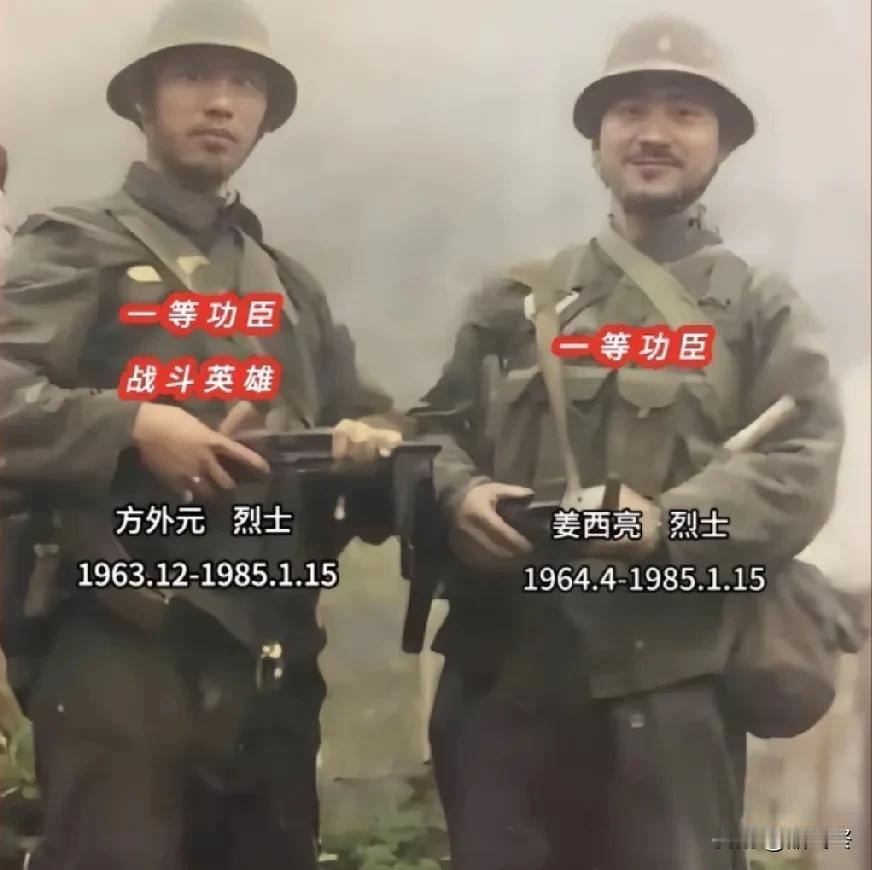 请停留一秒,向英雄致敬! 1985年“1.15”老山战斗中,有两位英雄在同一天英勇捐躯。方外元孤身前往145阵地侦察,回撤时遭遇数名越军围攻,重伤之下毅然拉响光荣弹与敌人同归于尽,他用生命捍卫了祖国尊严,获“战斗英雄”称号。而姜希亮在146阵地,毙敌2名、伤敌3名,为掩护战友身负重伤,最终因流血过多牺牲。 青山有幸埋忠骨,山河无恙慰英魂!致敬