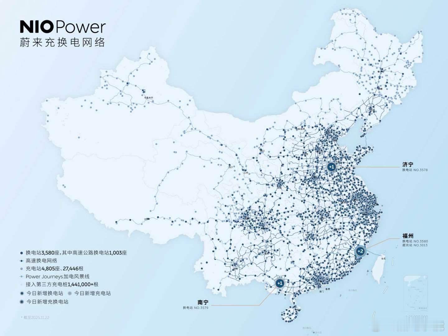 11月22日 NIO Power 4站上线 NO.3578 蔚来换电站 | 济宁汶上九华山路 NO.3579 蔚来换电站 | 南宁竹溪立交 NO.3580 蔚来换电站 | 福州永泰三状元 NO.3013 蔚来超充站 | 福州永泰三状元