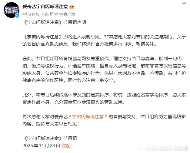 《宇宙闪烁请注意》明确嘉宾排序规则,以姓名首字母为依据,公平公开呈现阵容,期待值拉满。