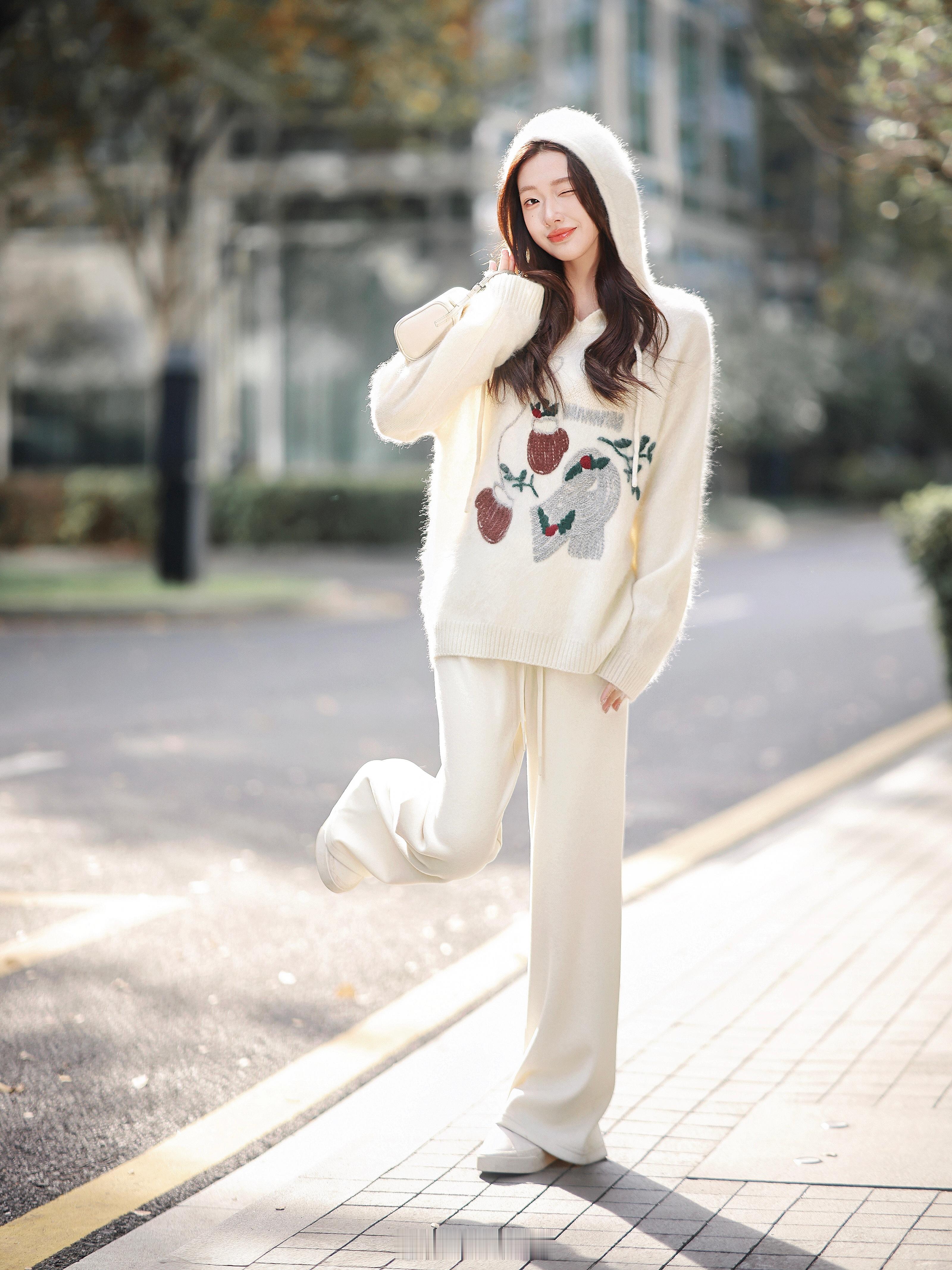 毛绒毛衣+微喇白色牛仔裤=温柔到发光