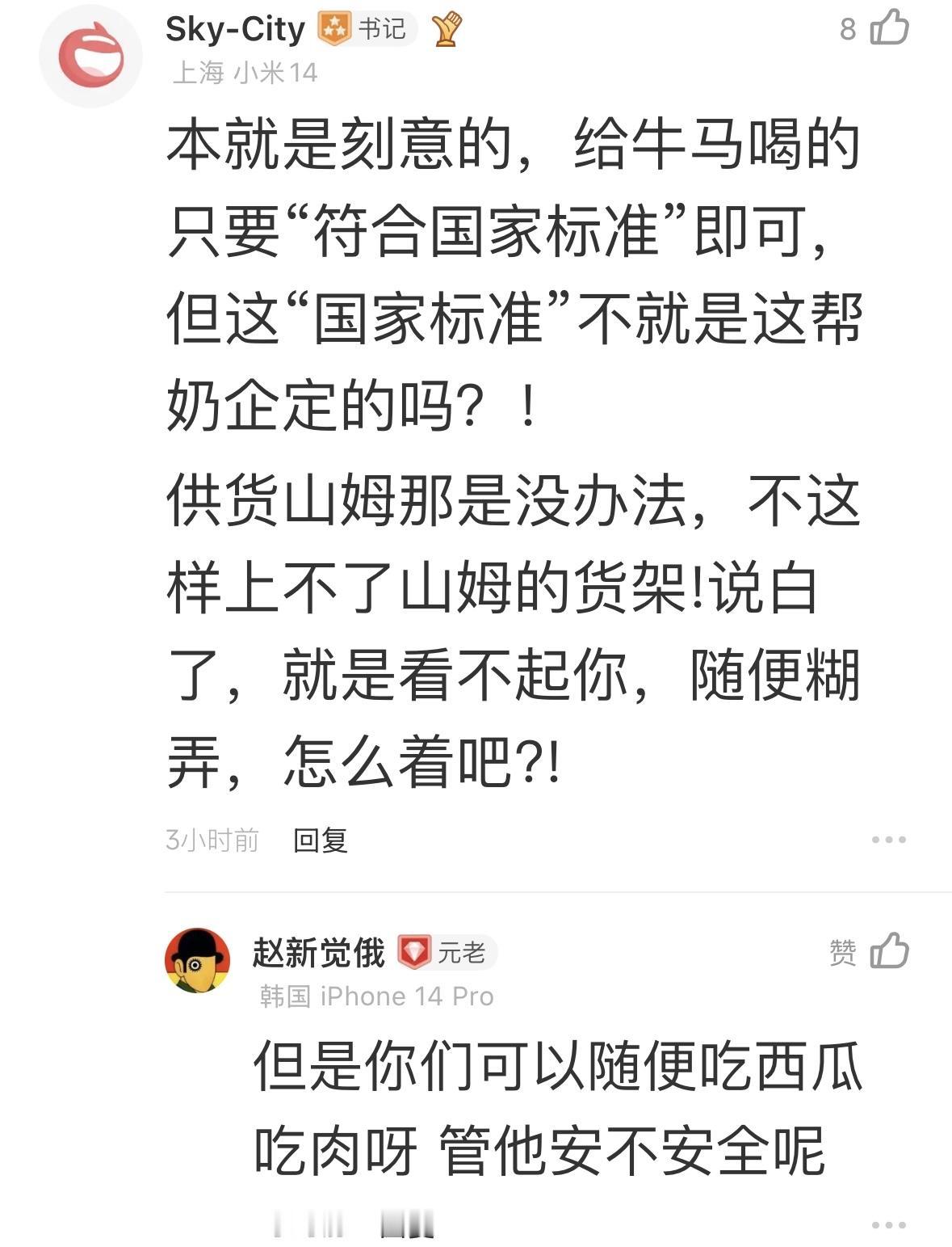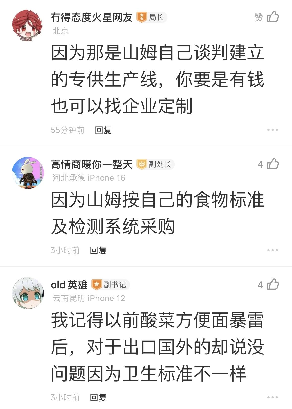 不知道,为什么制定不一样的标准?一种说法是,国家标准都是产业协会制定,产业协会又都是这几家大公司构成的,所以说,国家标准实际上是企业自己给自己定的标准,不知道这个说法是不是对?但是,我觉得国家标准应该按照人体的健康需要制定,从人体上来说,中国人和外国人应该差不了太大,所以,也应该是一样的标准,不应该有太大差距,就是说,执行的标准不一样,但是,质量是一样的。山姆