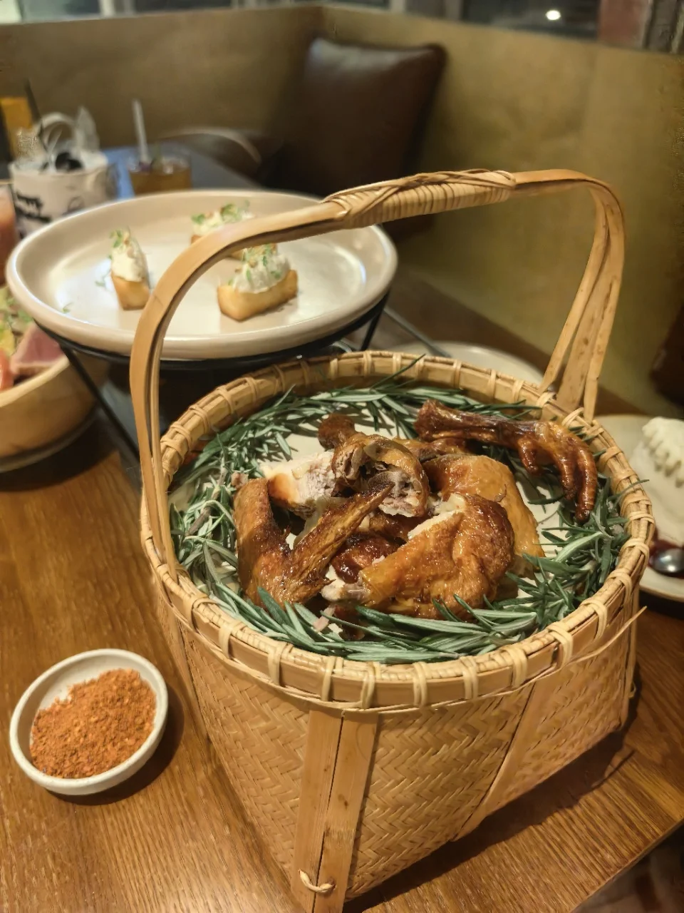 【木姜子烤安吉竹林鸡】虽然等了30分钟,但完全值得!竹林鸡装在竹篮里上桌,外皮烤得焦脆带油光,肉质却细嫩多汁,蘸上辣酱粉,解锁竹林鸡的神仙吃法👍👍