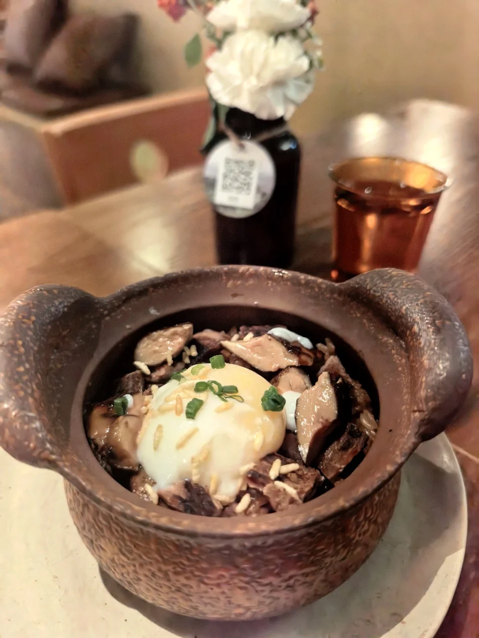 【香煎鹅肝牛肉饭】连餐具都精致到犯规!打开陶盖的瞬间,浓郁的鹅肝香气直钻鼻腔😇,拌上软糯米饭和流心溏心蛋,米饭的甜香与鹅肝的醇香交织,口感层次丰富❤。