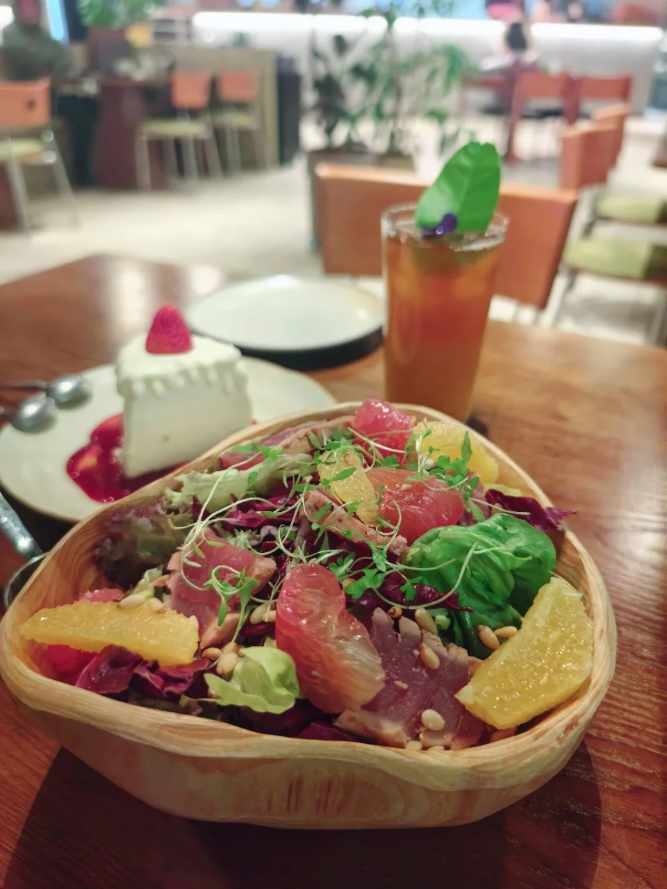 【金枪鱼柑橘沙拉】金枪鱼搭配新鲜水果和蔬菜👀,五颜六色的摆盘看着就超有食欲!淋上特制酱汁,食材的清爽与酱汁的鲜香融合,每一口都新鲜满足🤡。