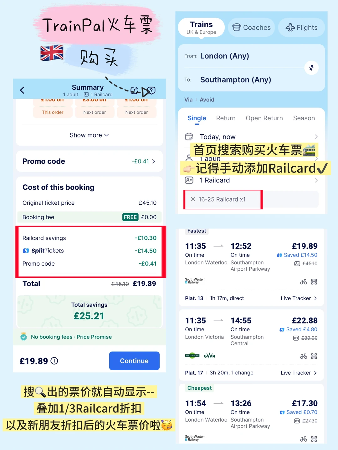 👉🏻记得手动添加Railcard!✔️这样搜索出的票价就自动显示--叠加1/3Railcard折.扣以及新朋友折.扣后的火车票价啦🥳