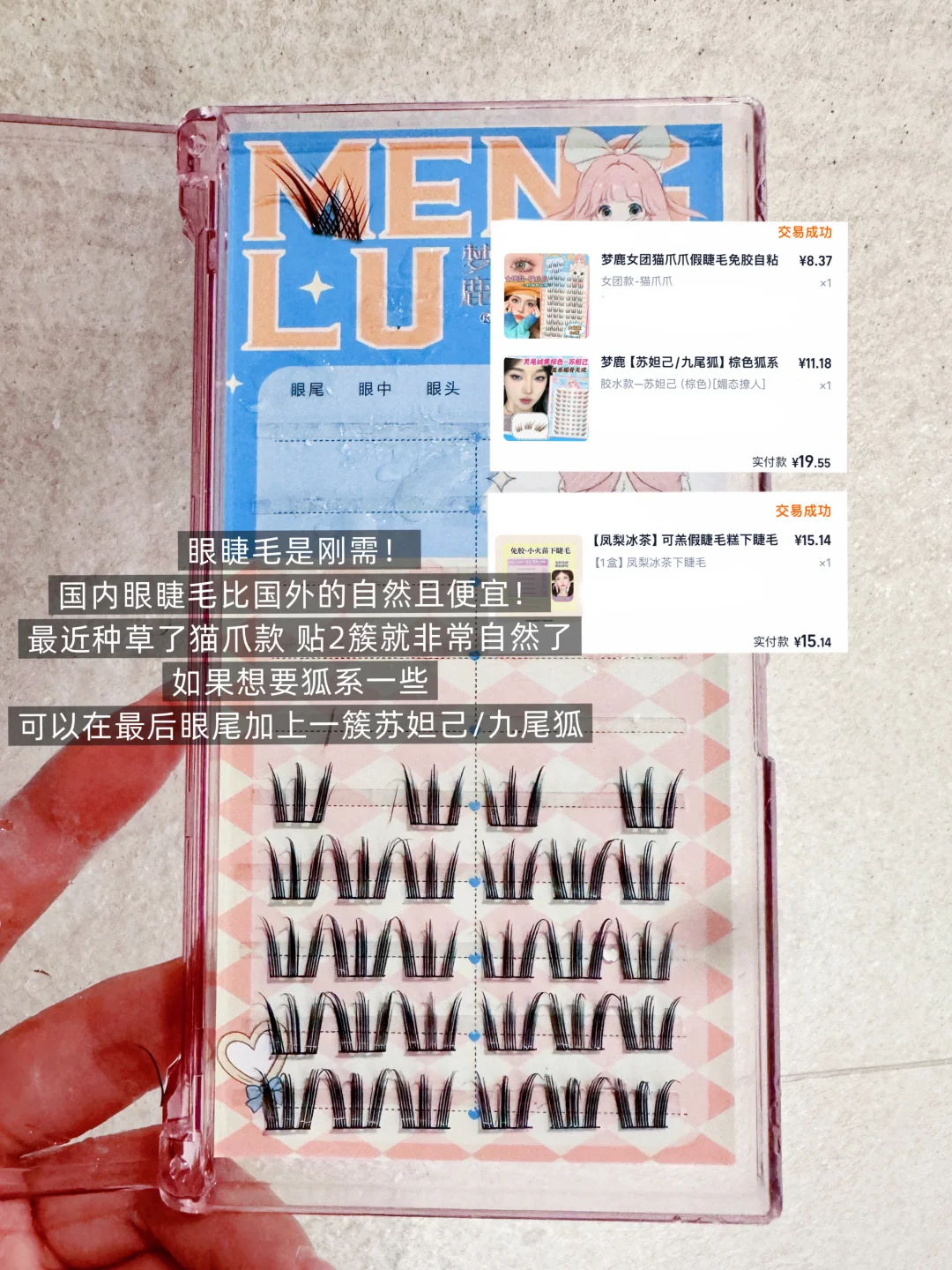 这也是转运必囤!上睫毛我喜欢猫爪款➕狐系(苏妲己),下睫毛可以买免胶款,更加好贴!