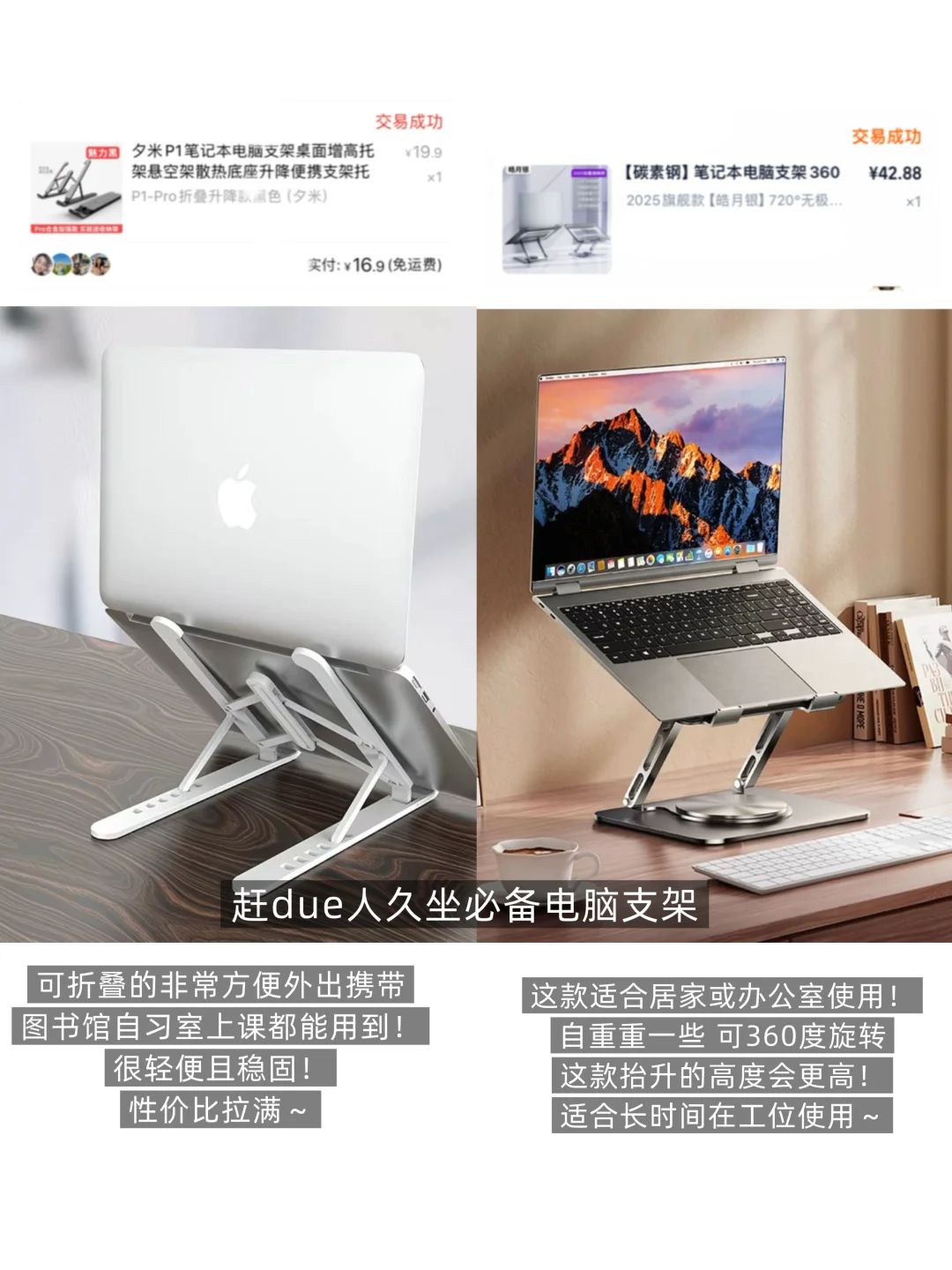 折叠款方便外出携带,图书馆自习室上课都能用到!另一款适合居家或办公室使用,自重重一些 可360度旋转,抬升的高度会更高!适合长时间在工位使用~