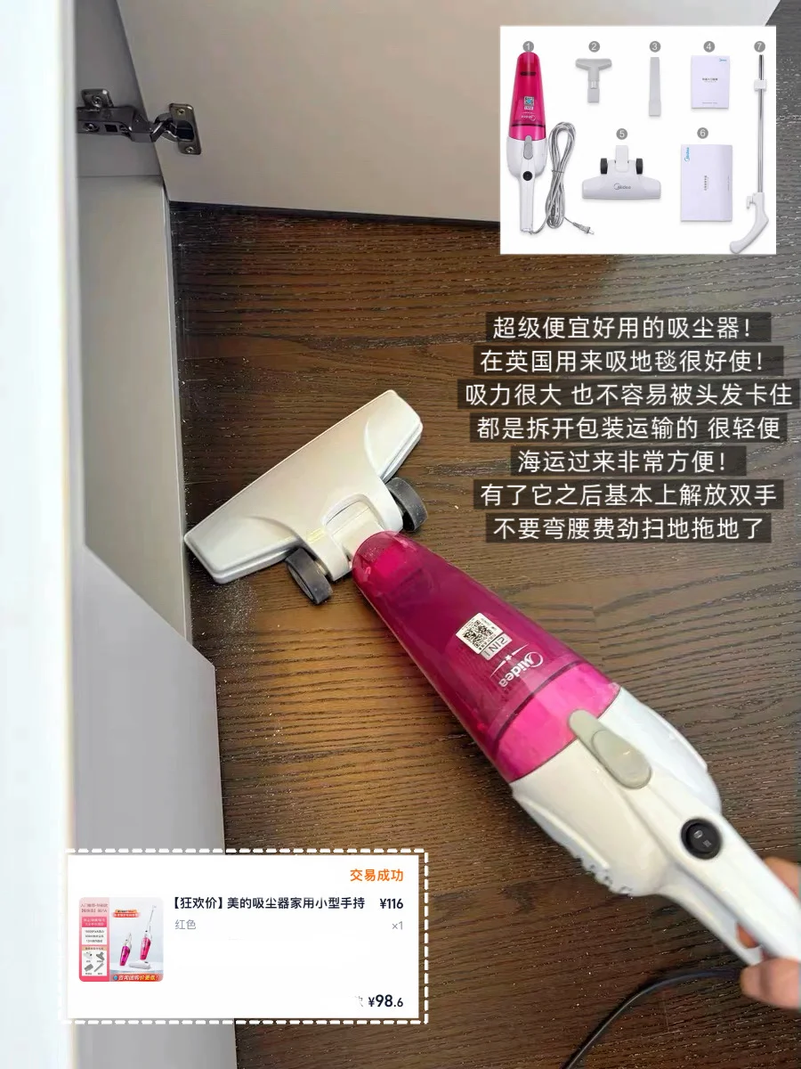 超级便宜好用的吸尘器!在英国用来吸地毯很好使!吸力很大 也不容易被头发卡住📦都是拆开打包运输的,很轻便,海运过来非常方便!有了它之后基本上解放双手,不要弯腰费劲扫地拖地了!