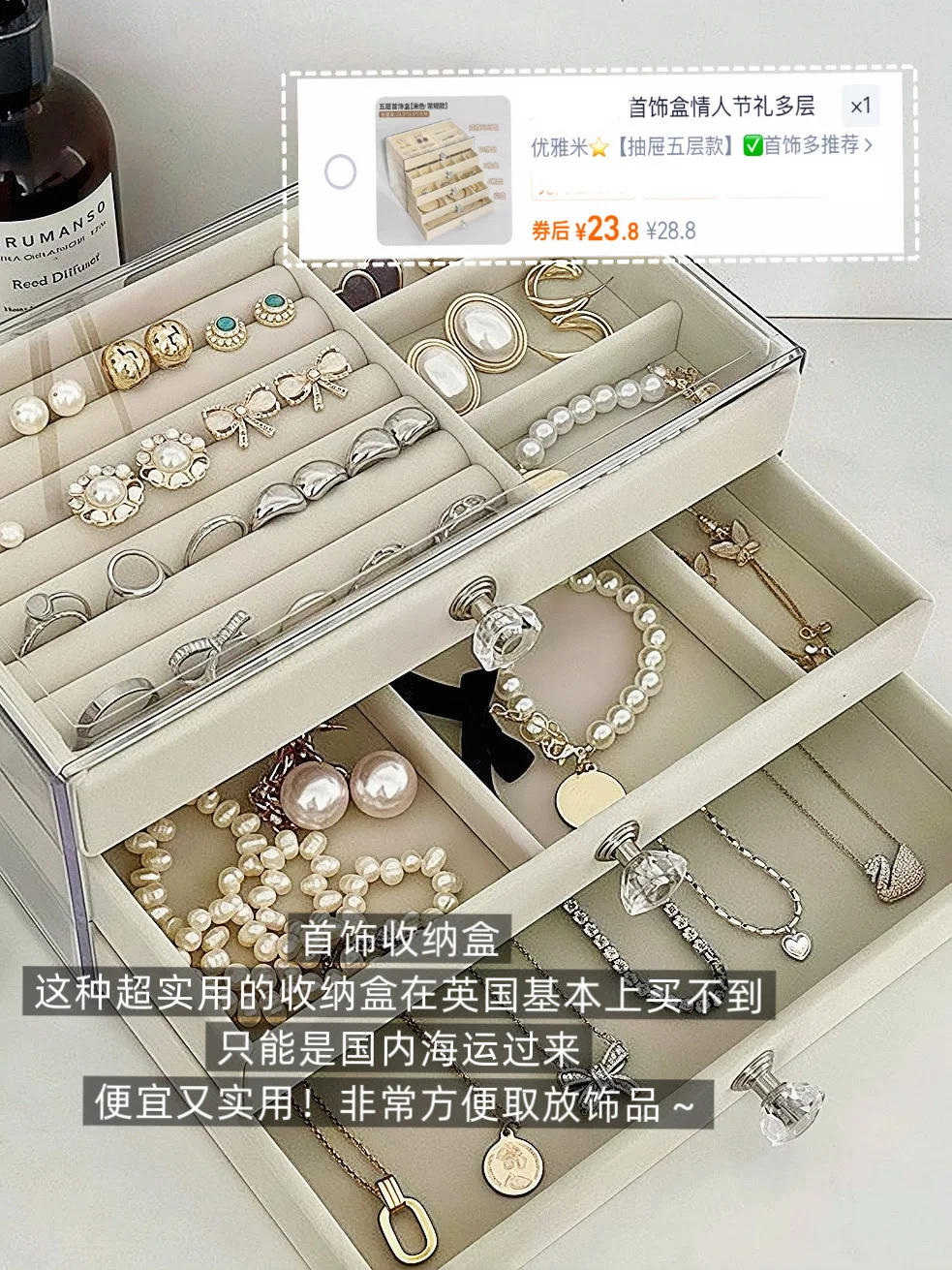 三层首饰盒能同时收纳耳钉、项链、戒指💍方便出门拿取!英国基本很少见,要么就很贵,还是国内🍑便宜!