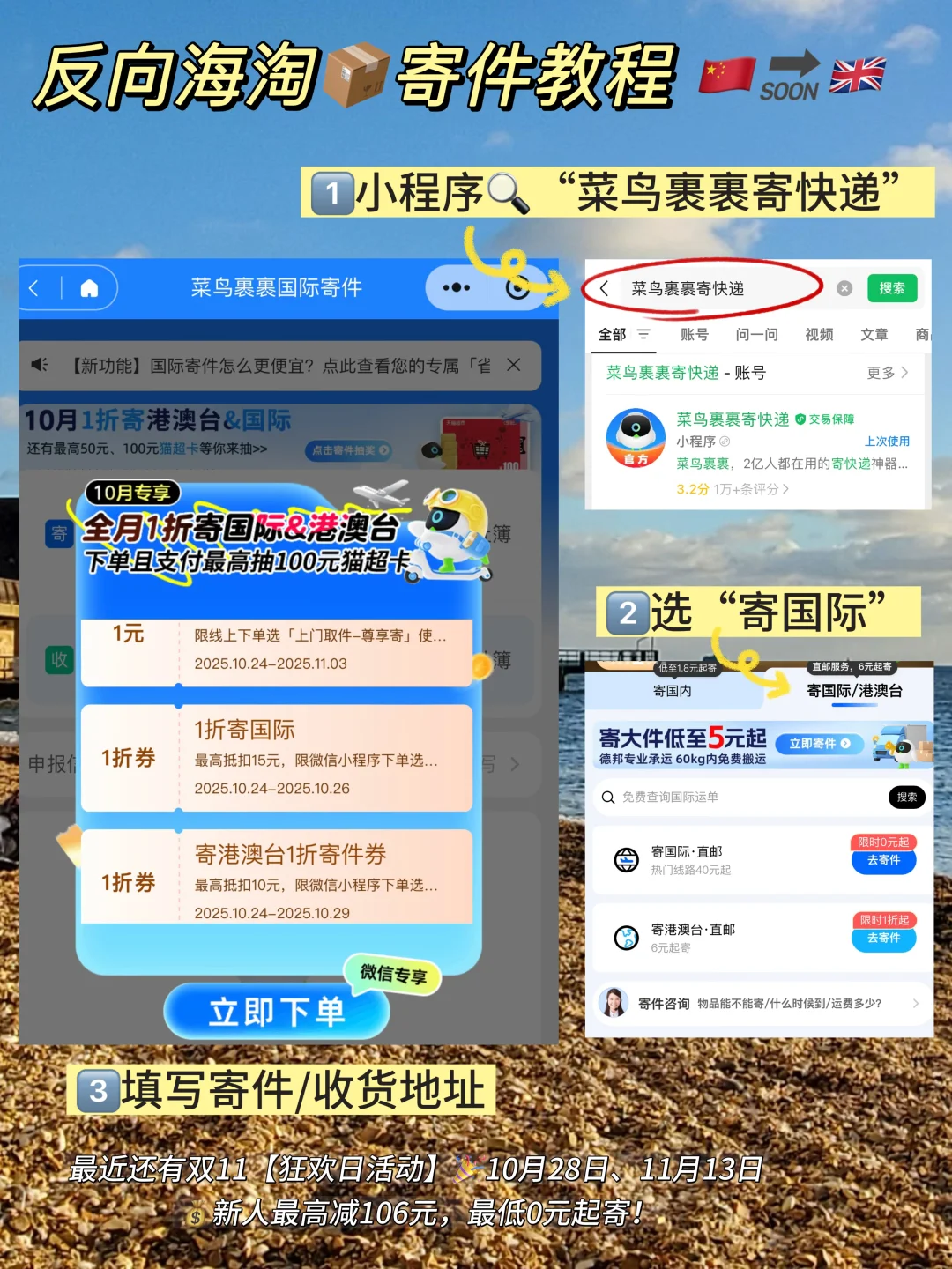 最近还有双11【狂欢日活动】🎉10月28日、11月13日 🆕 新人最高减106元,最低0元起寄!超适合趁现在一次囤齐留学生活好物🩵