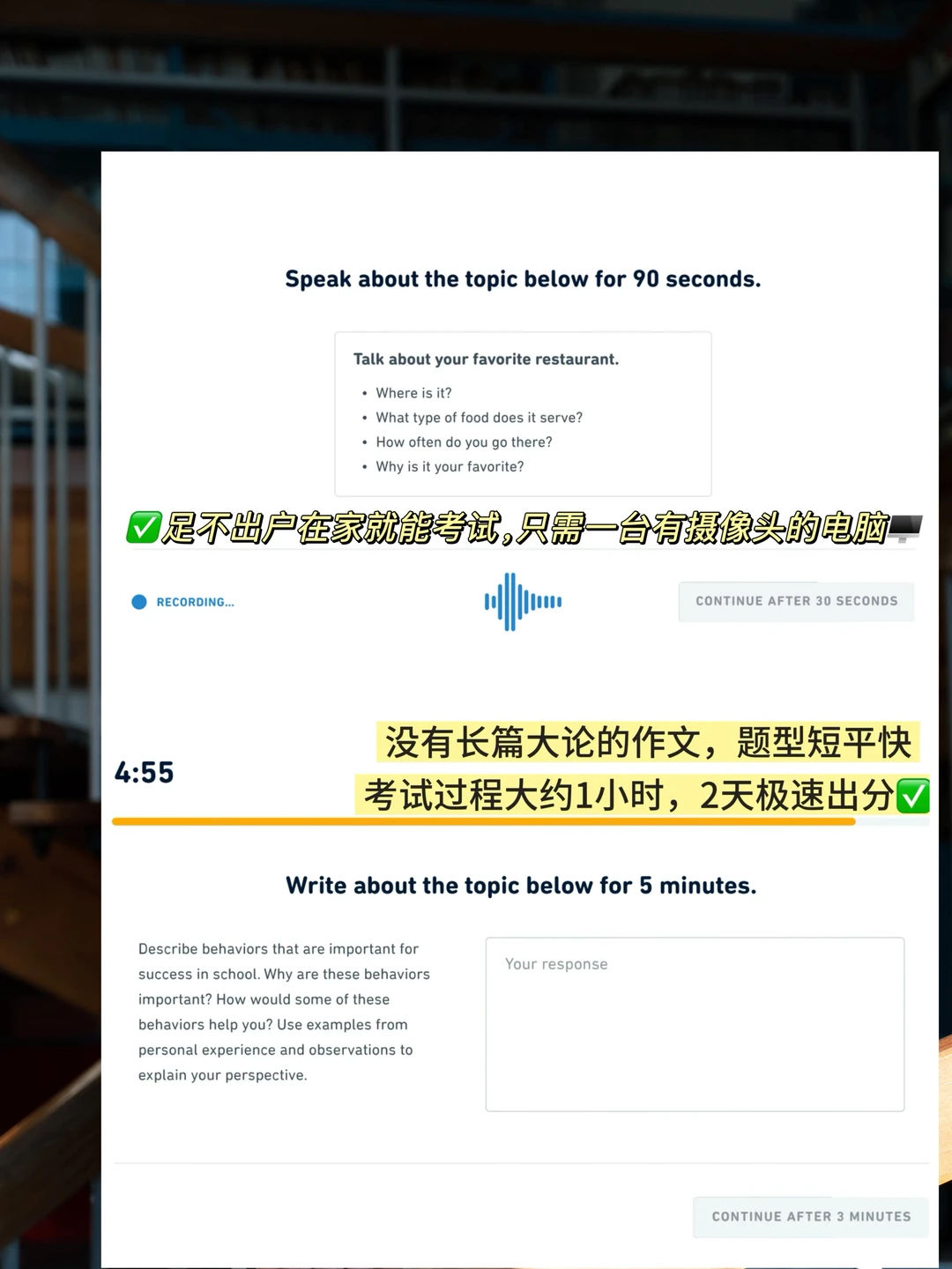 * DET随时随地考试,出分快(48小时),更适合有快速得到分数需求的同学!出分后30天内可以再冲刺两次!备考体验也很好。