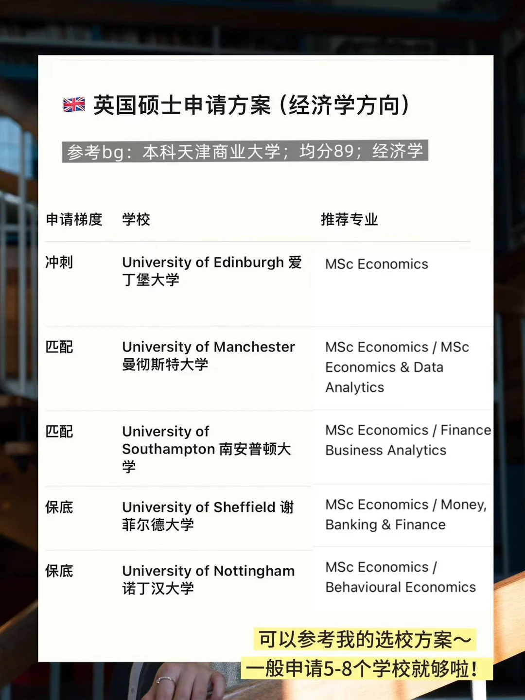 冲刺:G5院校(如UCL、LSE)或热门专业(如金融、计算机)