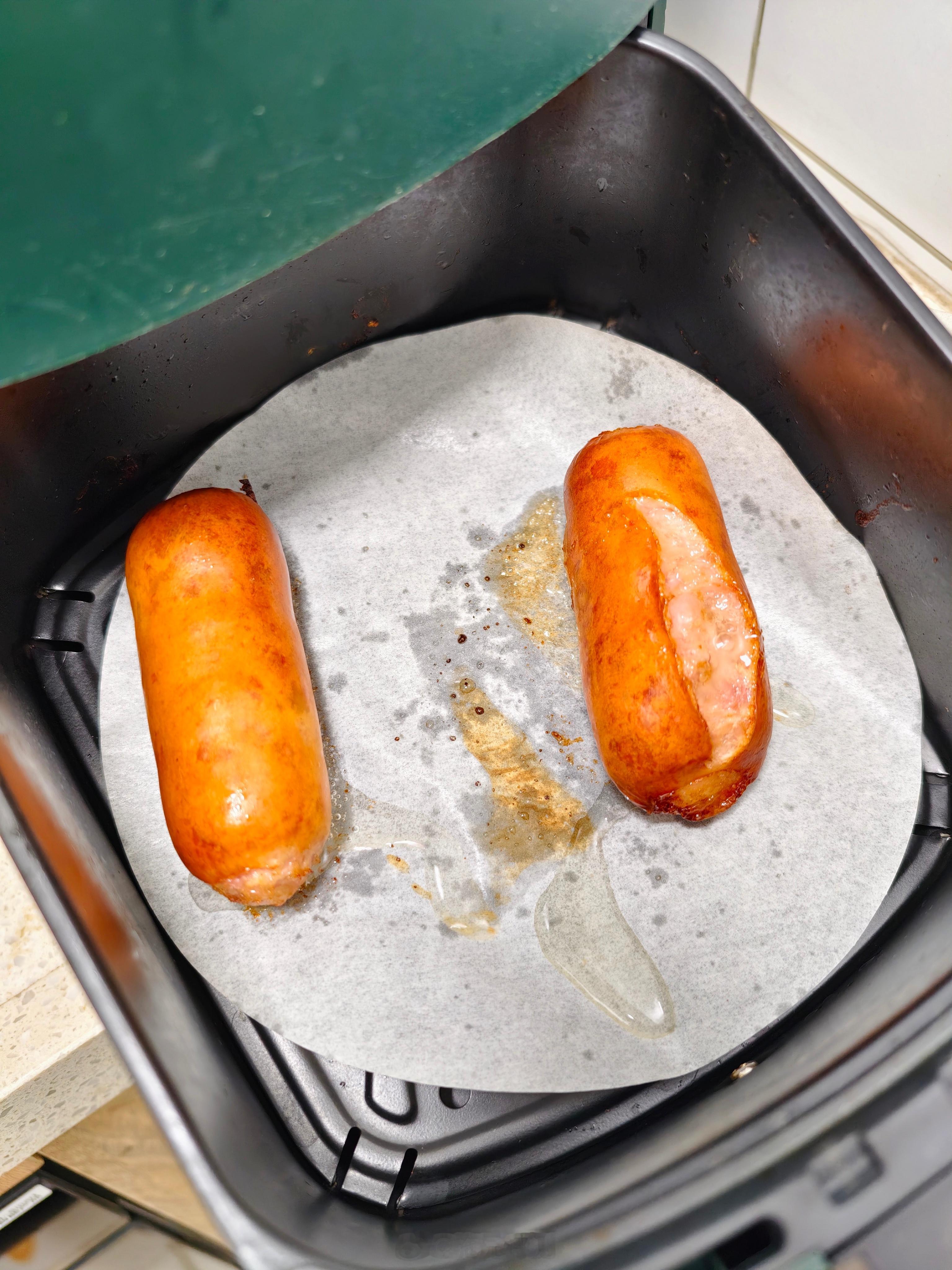 晚餐没吃饱,有点饿本来想煮方便面,怕吃不完直接用空气炸锅炸烤肠直接爆了