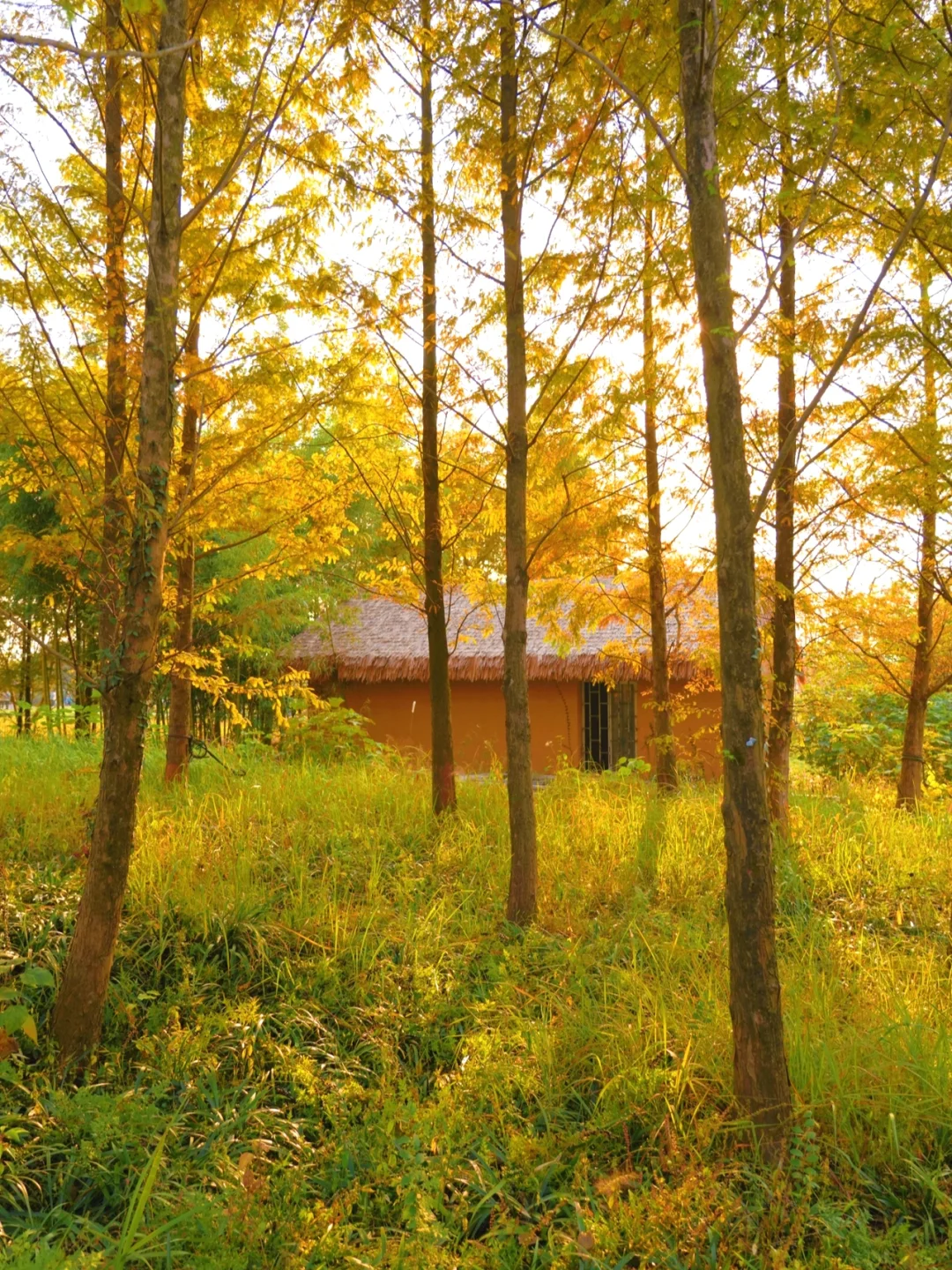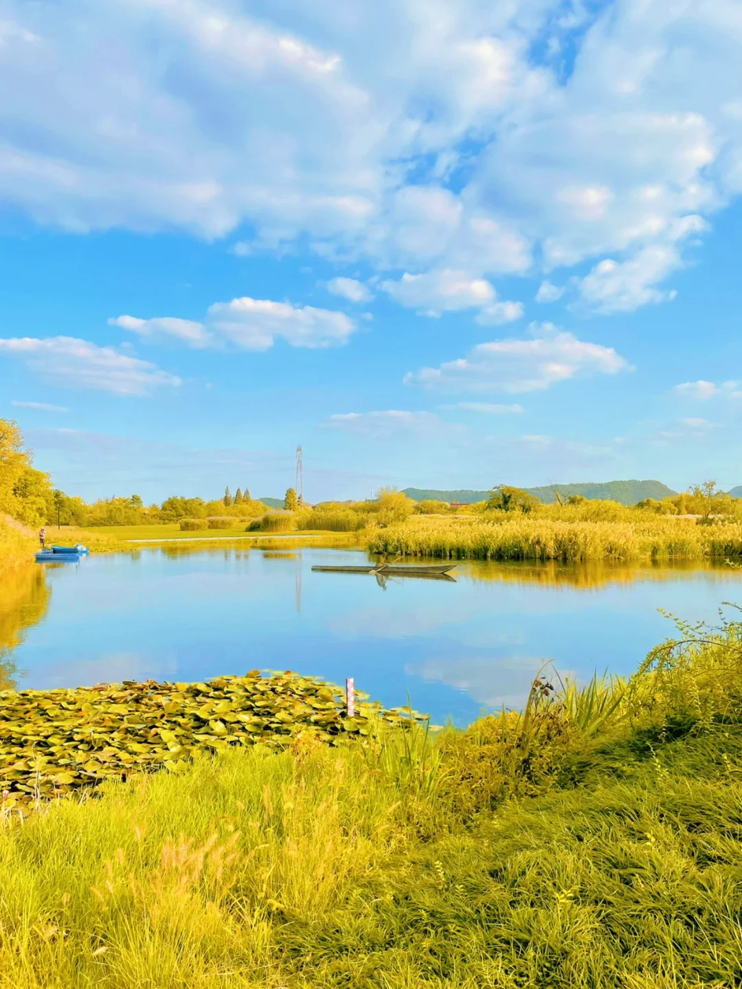 芦苇荡丛、大片斜坡草坪、茅草屋、