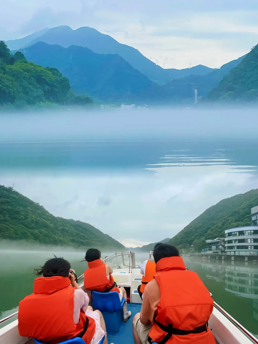 ❾梦幻新安江龙舟雾漂,导航至“风月轩码头”,乘坐快艇/龙舟,穿行在诗画江南的白雾中,17℃的新安江太美了!原来日常喝的农夫山泉就是从这里流向全国各地!