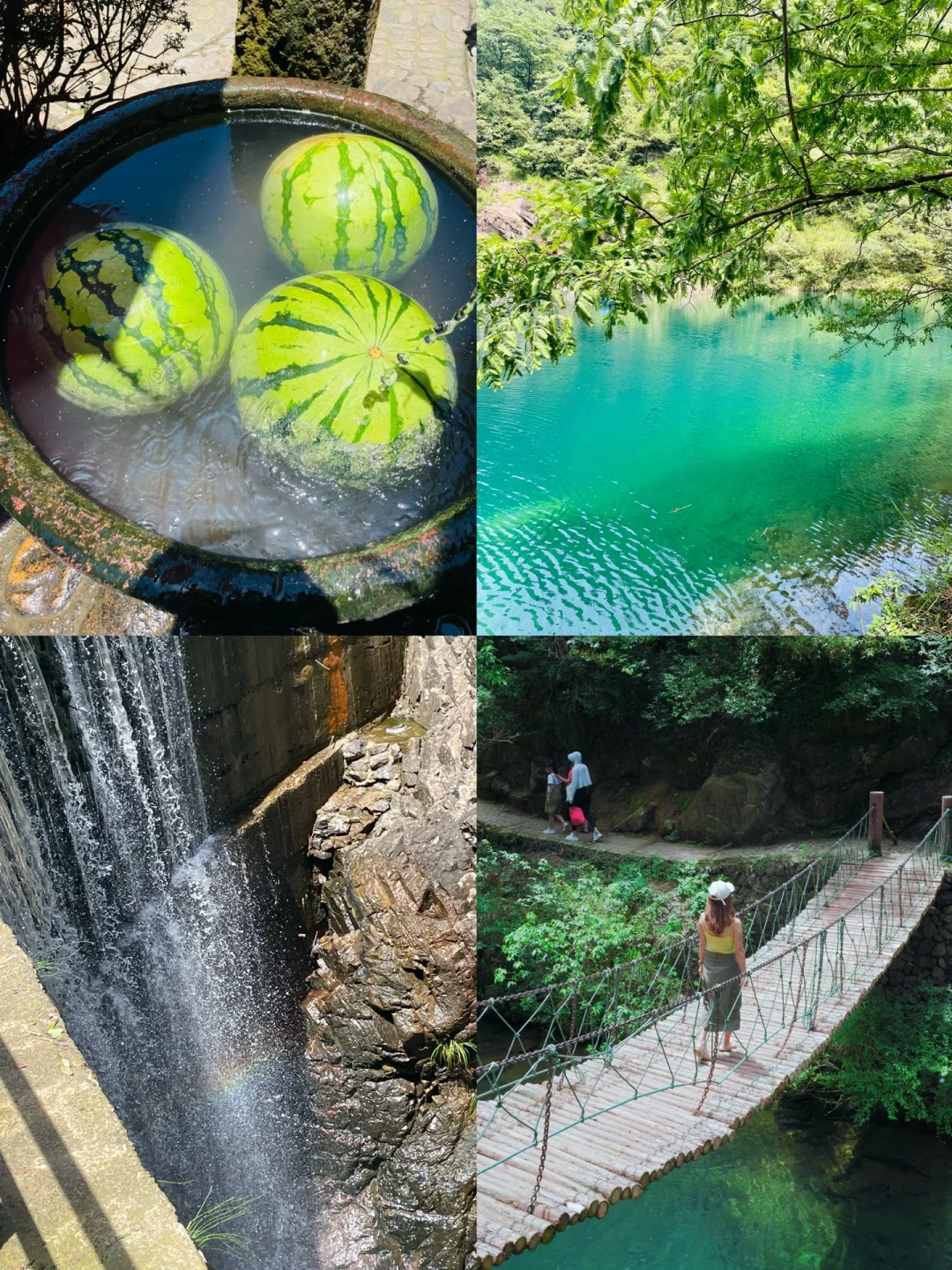 竹径通幽→青青世界游乐园→古桥(可以玩水)→瀑布水潭→水帘瀑布(壮观!)→铁索桥→石滩→悬崖瀑布→石头屋(有冰西瓜🍉吃)→绳桥(好玩)→天池→大奇飞瀑→丛林飞鼠→金牛潭(有喊泉)