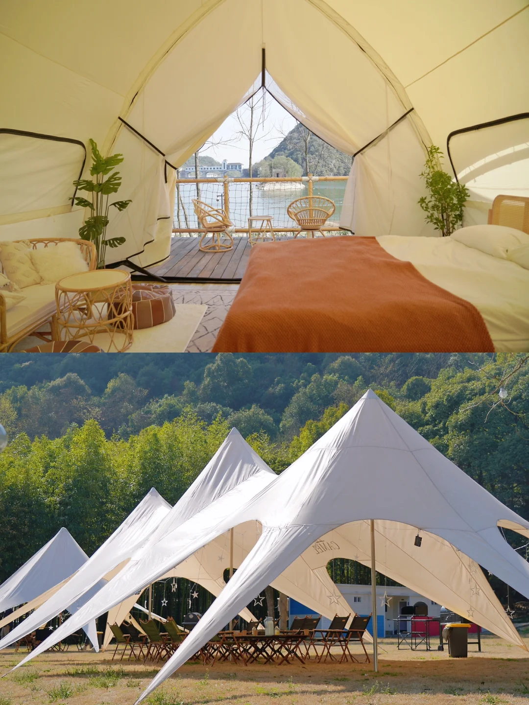 ▪️有湖景豪华帐篷⛺️、山野家庭帐篷、木平台营位以及草坪营位等,一站式满足各种需求,适合闺蜜/情侣/家庭亲子游玩,也很适合团建/聚会等