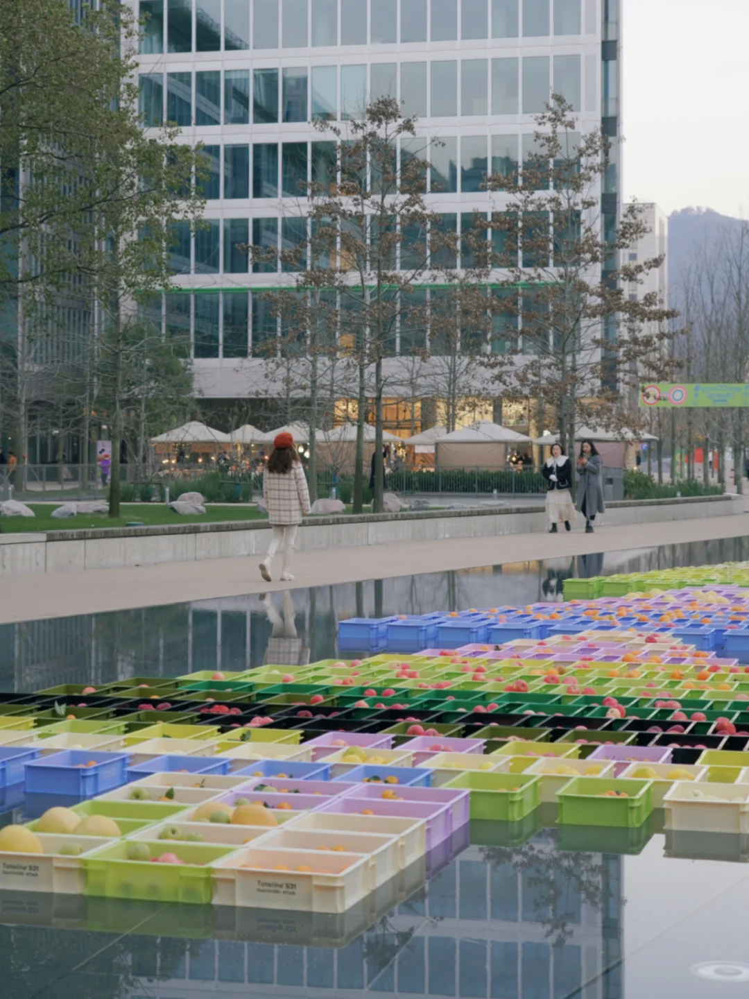 水镜里还用水果搭建了个躺平的「水上圣诞树🎄」,由8200+新鲜水果组成,按色彩统一摆放在南侧水镜上,还是蛮震撼的,如果能站在高空拍就更好了(如图9⃣️)官 方说今天会免费分发给路人,大家快冲啊!(记得带好口罩,做好防护哦)