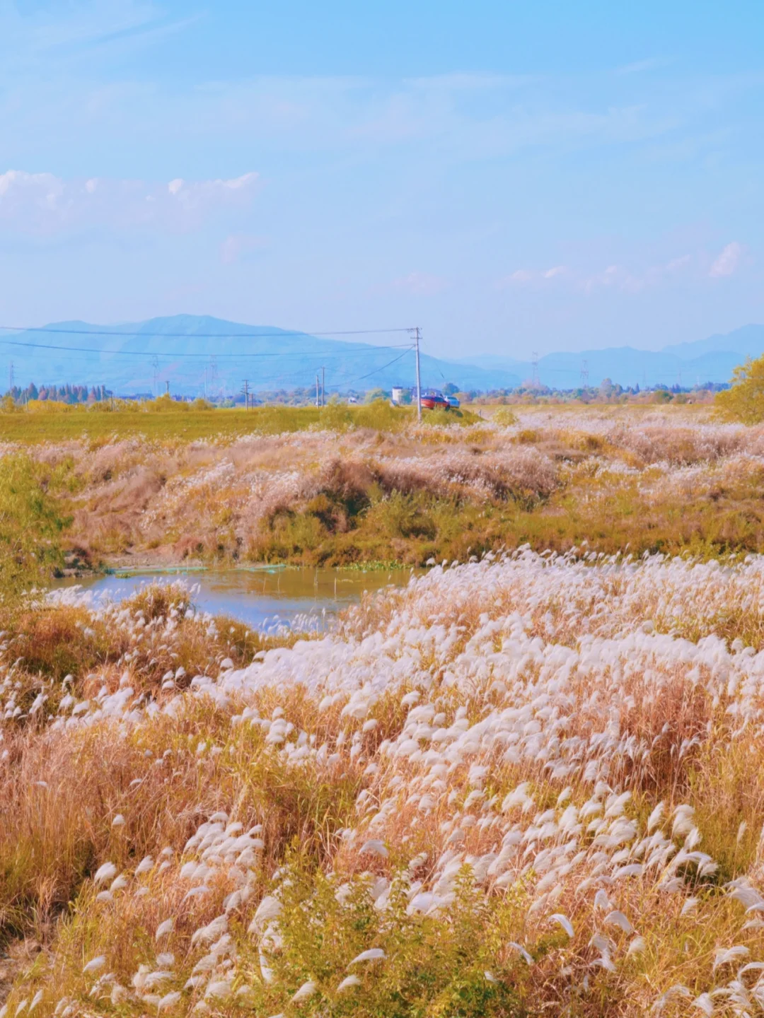 目前有大片芦花白、蓼红花和稻田,秋意正浓