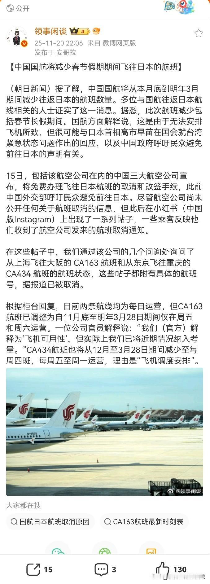 此法甚好! 车力巨人要是参拜靖国神社,希望中止直航。 据悉,中国国航将减少春节假期期间飞往日本的航班 (朝日新闻)据了解,中国国航将从本月底到明年3月期间减少往返日本的航班数量。多位与国航往返日本航线相关的人士证实了这一消息。据悉,此次航班减少包括春节长假期间。国航方面解释说,这是由于无法安排飞机所致,但很可能与日本首相高市早苗在国会就台湾紧急状态问题作出的回应,以及中国政府呼吁民众避免前往日本的声明有关。