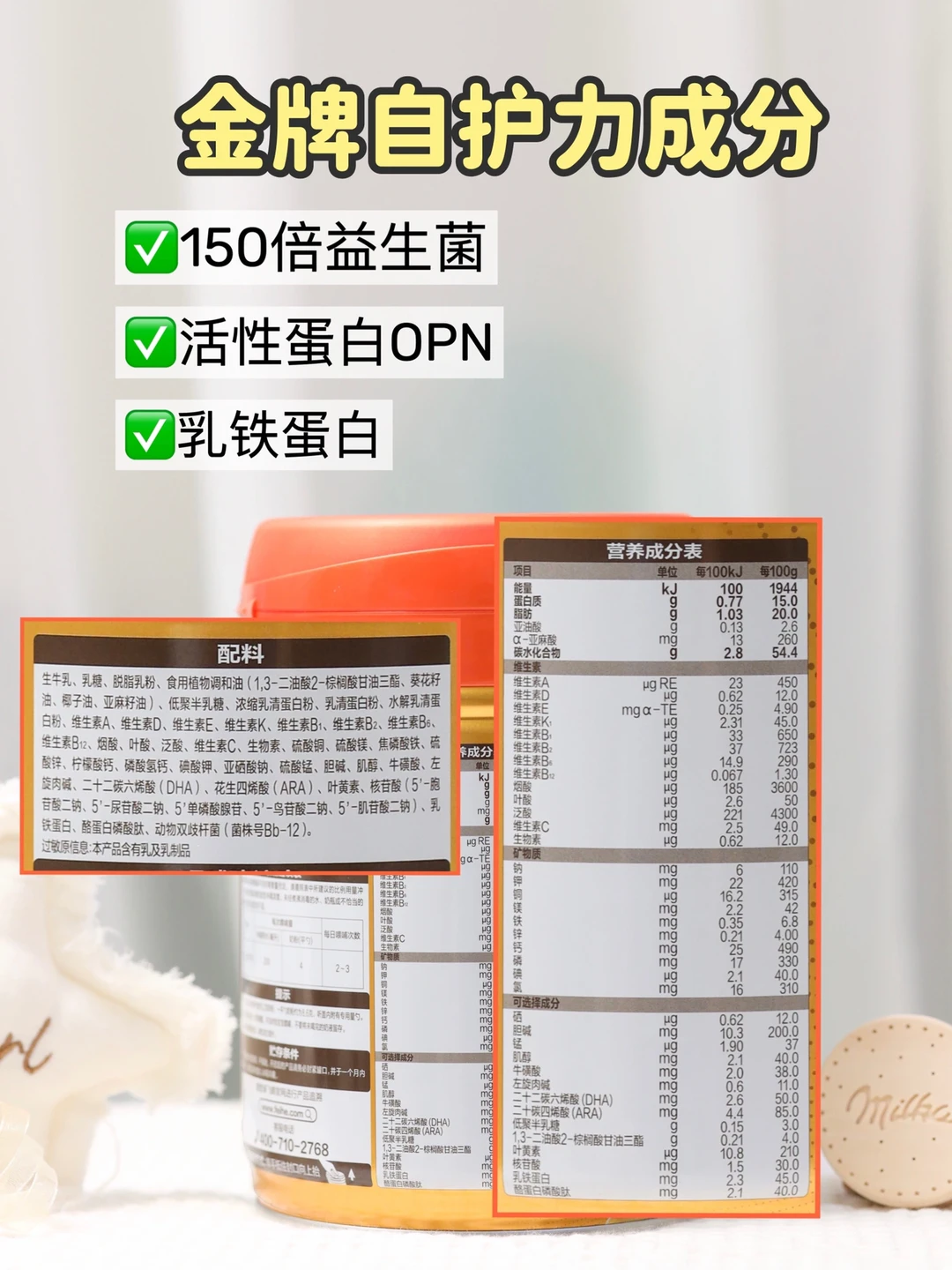 💪为了让娃的保护力跟上,里面还添加了150倍的益生菌,赋予宝宝肚肚内在保护力!还有珍稀源乳活性蛋白OPN+乳铁蛋白组成自护双蛋白,给宝宝构筑坚固的内外双重保护力!再搭配FHMO模拟母乳低聚糖,宝宝的小体格就更加在线啦!