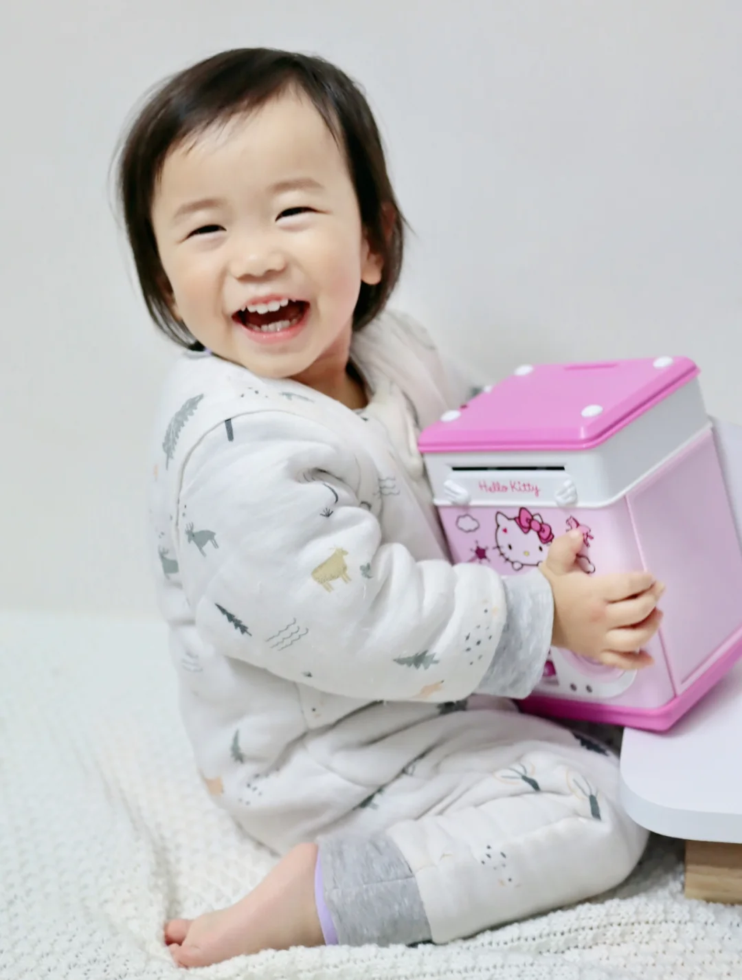 这个可不是普通的存钱罐,指纹开门、密码防护、音乐故事播放、紫光验钞、自动卷💰,它都可以噢~造型hin萌趣,而且两侧kitty猫的卡纸是可以更换的。