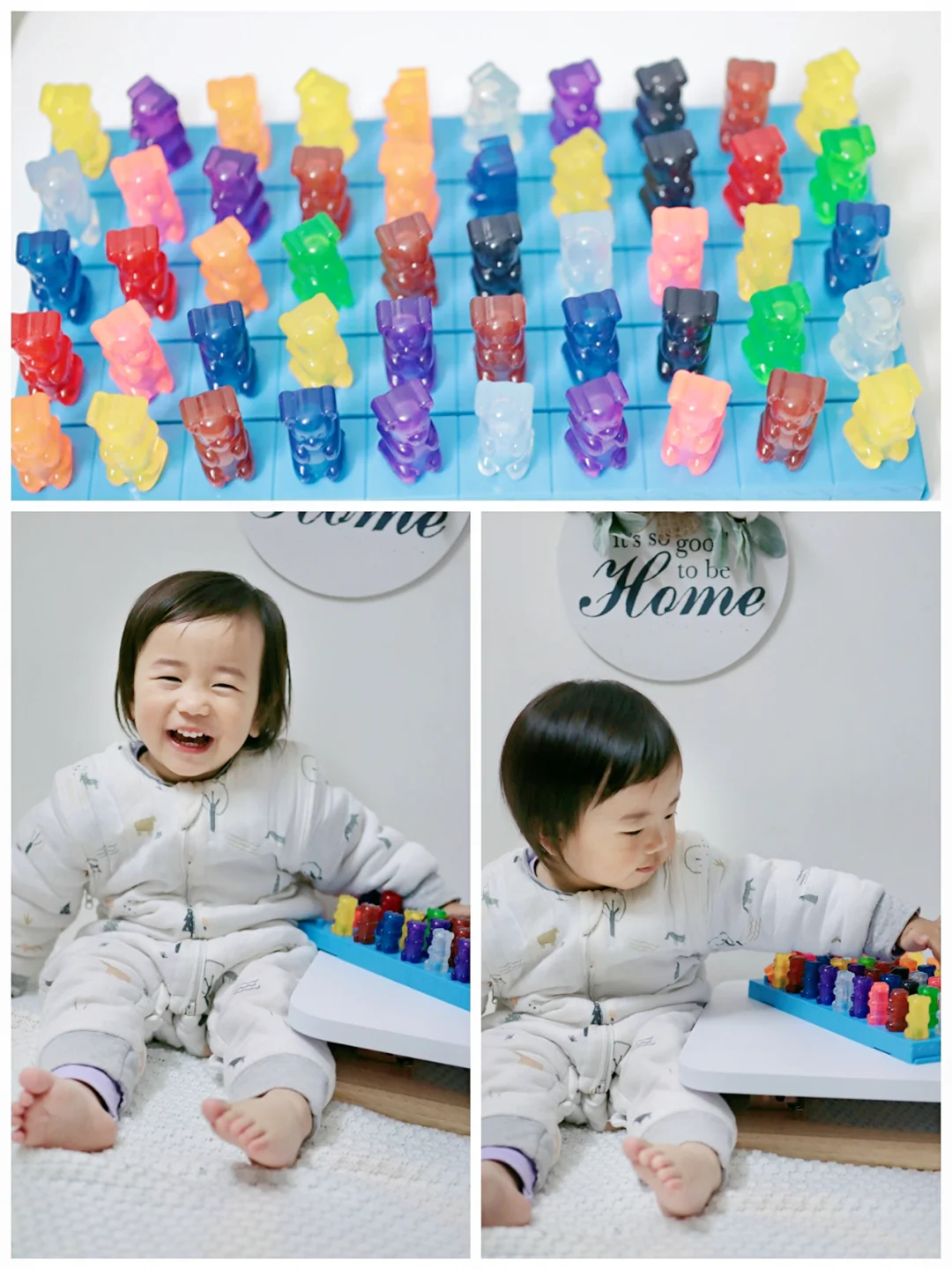 这个更适合大点的宝宝,可以学习加减数、十以内的运算、以十为基数的运算和位置等数学知识。我现在是给Cyndi学习认识颜色、锻炼她的动手能力和专注力,熊仔糖的造型hin吸引宝宝注意力,让她自己把小熊🐻放到果冻条上去。等宝宝再大一点,更能充分发挥这个玩具的价值😬