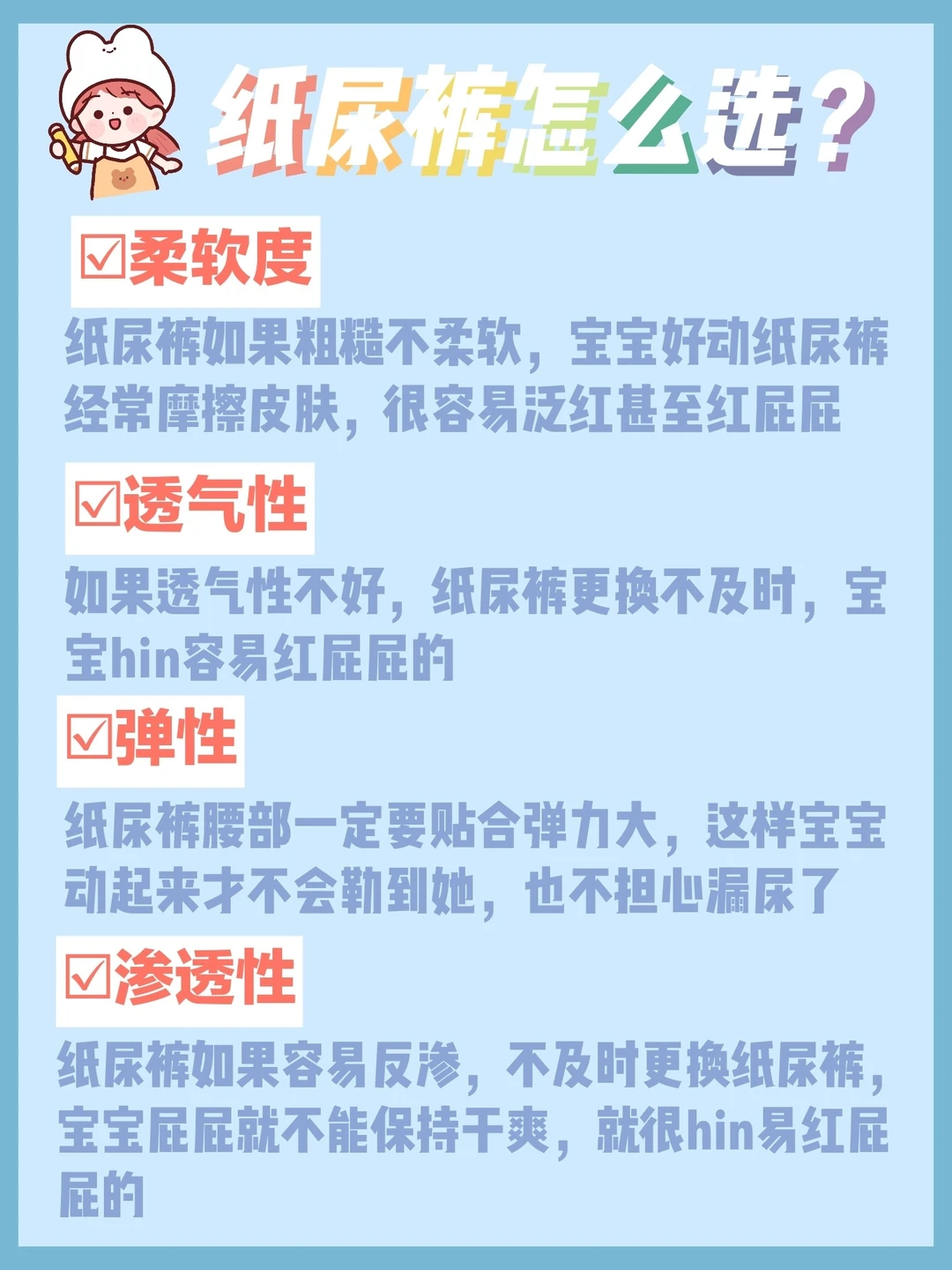 这个也是纸尿裤必看的指标了‼️如果透气性不好,婴儿纸尿裤更换不及时,宝宝hin容易红屁屁的