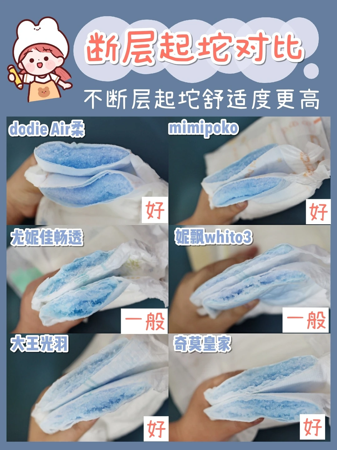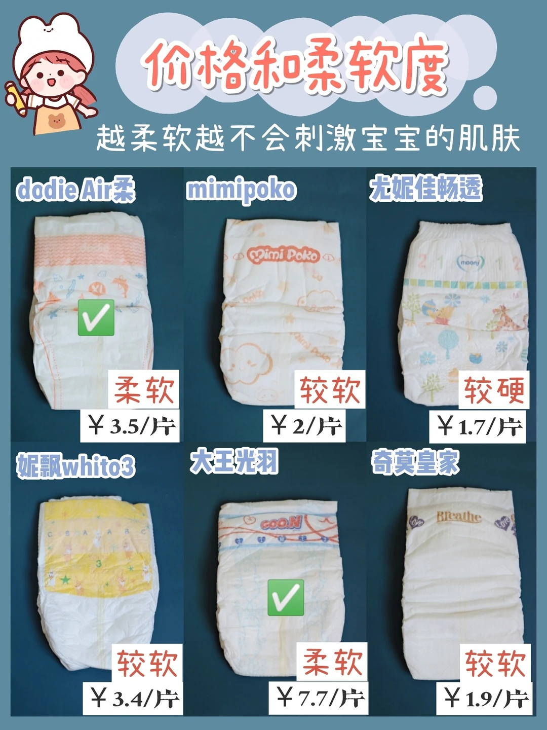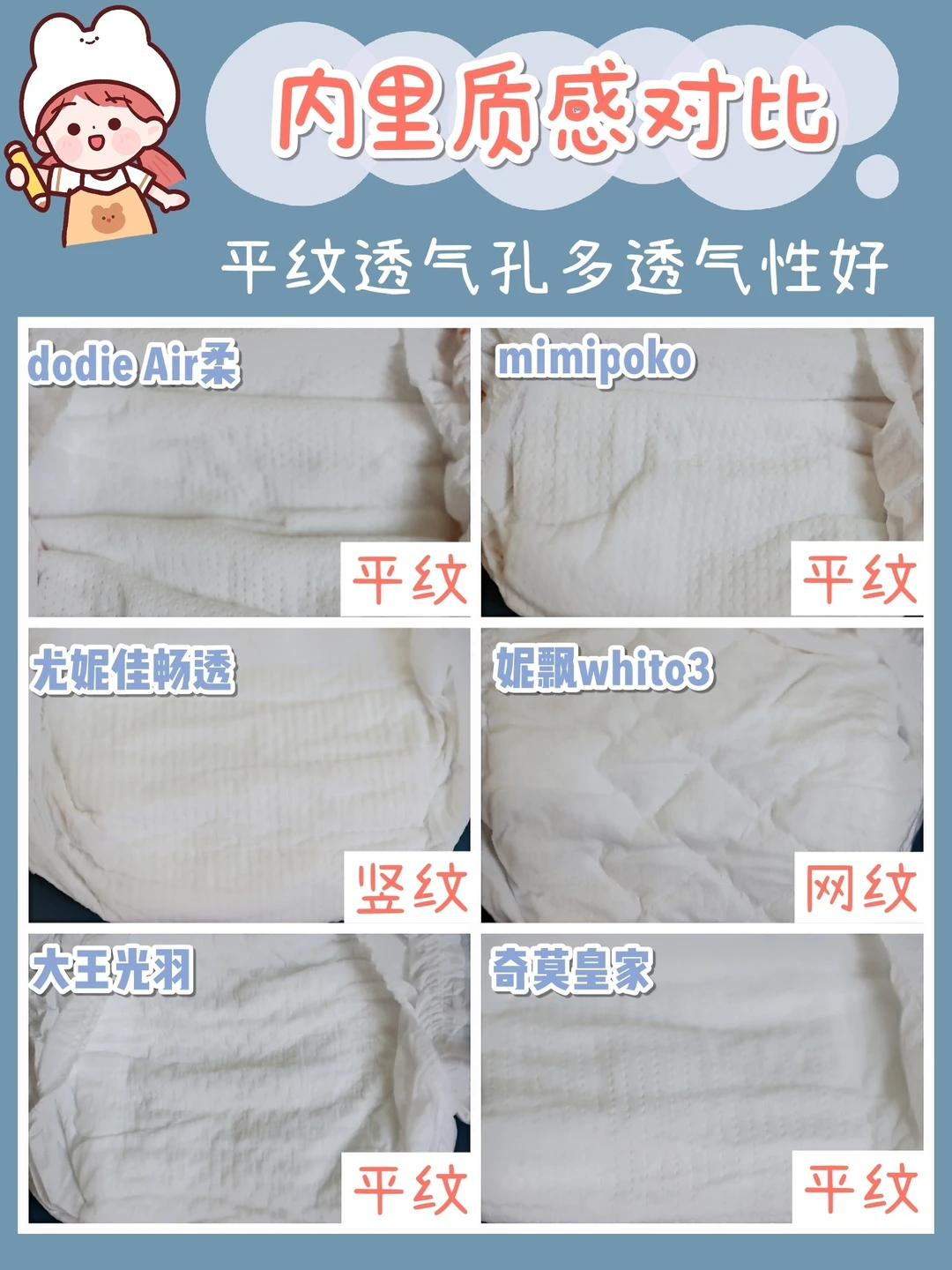 这6款纸尿裤明显是dodie Air柔、大王光羽比较软,奇莫皇家和妮飘whito3、泰国mimipoko也还不错,尤妮佳畅透稍硬一点