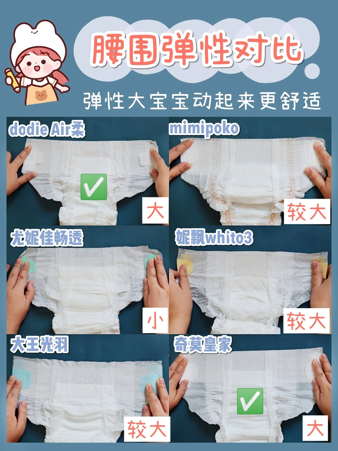 dodie Air柔和奇莫皇家弹力大,妮飘whito和mimipoko适中,大王光羽、尤妮佳畅透弹力较小