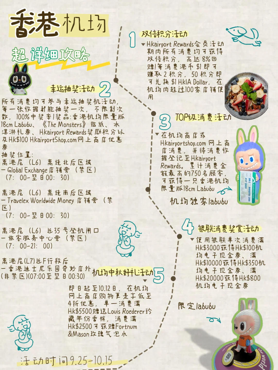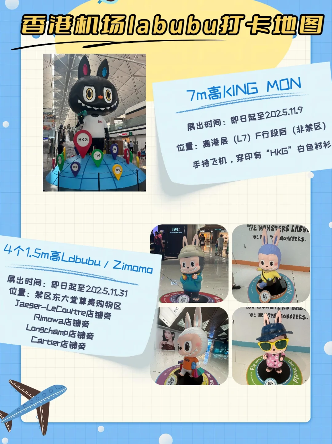 谁懂啊!本来是赶早班机飞内地🛬\n结果在香港机场看到Labubu直接走不动!\n11.30号之前在禁区内东大堂尊贵购物区内有4个1.5m的限定 Labubu和Zimomo 打卡位\n位置就在Jaeger-LeCoultre、Rimowa、Longchamp、Cartier这四家店铺旁边\n在非禁区麦当劳的下方还有7M的KING MON,好像说是全球最巨型的!\n\t\n在9.25-10.15号还有超级多活动(想知道具体细节的直接看图2哦):\n\t\n✅ HKairport Rewards会员在活动期内消费 HK$1可赚2奖赏积分,每50积分可换1HKIA Dollar 当 HK$1于机场内超过 100 家参与商户及餐厅使用\n✅ 所有消费均可参与香港国际机场幸运抽奖机活动,还有机会赢取龙家升先生特别为这次与香港国际机场的合作而设计的机场限量版18厘米拉布布手办,THE MONSTERS贴纸等丰富奖赏!位置就在Global Exchange店铺旁、通济隆外币找换店、旅客服务中心旁和香港迪士尼乐园奇妙店外可以抽奖!\n\t\n✅ 在机场商店或 HKairportShop.com 网上商店消费累计最高的前750还能获得香港机场独家限量版Labubu\n✅ 凭银联卡消费可享高达港币$2,500 银联机场电子现金券!\n✅ 即日起至10.12日,在机场网上商店单一消费达到指定金额,还能获得不同中秋限定赠品\n\t\n在香港机场内买大牌包包,免税+汇率差直接省出一个香奈儿!!\n\t\n🛍LV\n老花款摆得满满当当🔥\n关键免税 + 汇率差\n部分商品价格比内地便宜4%-6%\n算账的时候我都忍不住笑出声!\n\t\n🛍CHANEL\n经典翻盖包、手提包看到直接挪不动脚!\n而且部分商品价格比内地便宜10%-16%\n直接省出大几千😄\n\t\n🛍DIOR\nMini Lady Dior Bag直接燃起少女心🤩\n部分商品价格比内地便宜4%-7%\n当场心动到跺脚!\n\t\n🛍Tiffany & Co.\n各种项链戒指连包装都透着心动💓\n部分商品价格比内地便宜6%-9%\n直接把“浪漫 + 省钱\" 焊死了!\n\t\n香港机场买奢侈品真的能爽到尖叫!还有百分百中奖的Labubu抽奖活动,要去香港的宝赶紧码住~\n