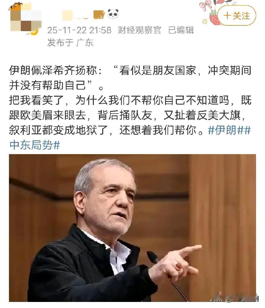 伊朗总统还好意思说有些国家看似朋友,伊朗和以色列冲突的时候,并没有帮助伊朗! 我觉得它暗指的应该有两个,不过伊朗总统还是先把苹果手机放下再说,自己亲西方亲到骨子里,还有脸说别人不帮你,等下帮你,你转身就投入西方的怀抱,背后捅刀子的事情,你们伊朗这些亲西方的政客可没少干,而且自己到现在还在用着苹果手机,那么多伊朗的科学家和政府被以色列精准定位,你们还在用西方的电子产品,你说帮你有什么用呢,而且叙利亚的阿萨德也在等着伊朗帮,结果伊朗就这样让叙利亚被西方拿下了,人家阿萨德是不是也要来喷一下你伊朗呢,你明明就是棋子,却总想当棋手,当棋手就得自己能扛事,而不是又想当棋手,又想别人把你当棋子一样来援助,这叫又当又立!