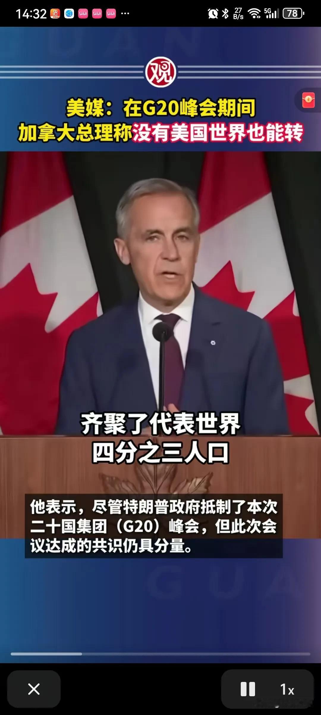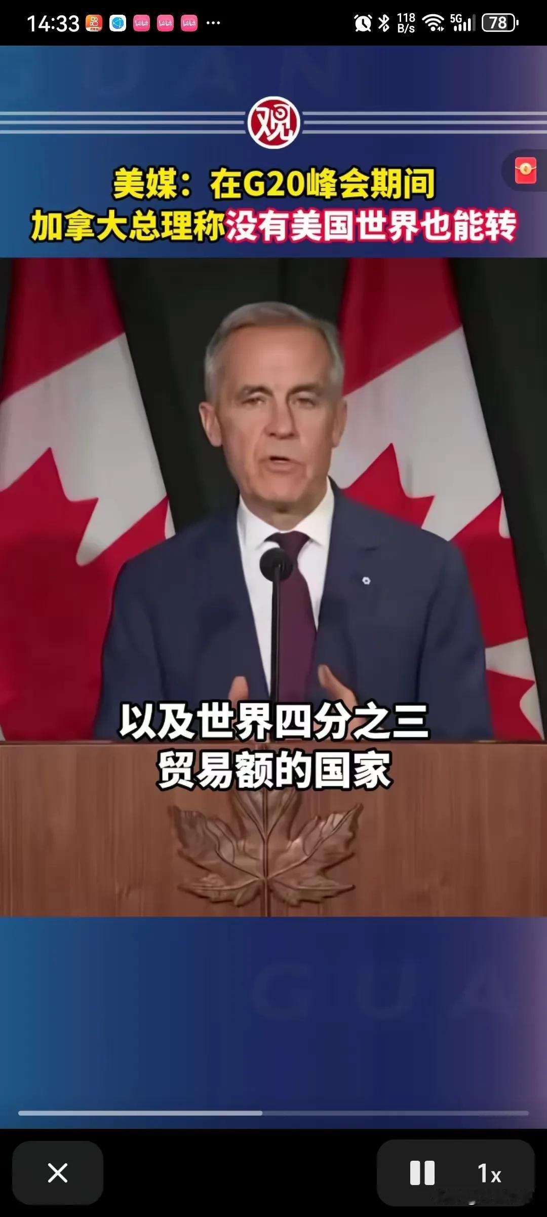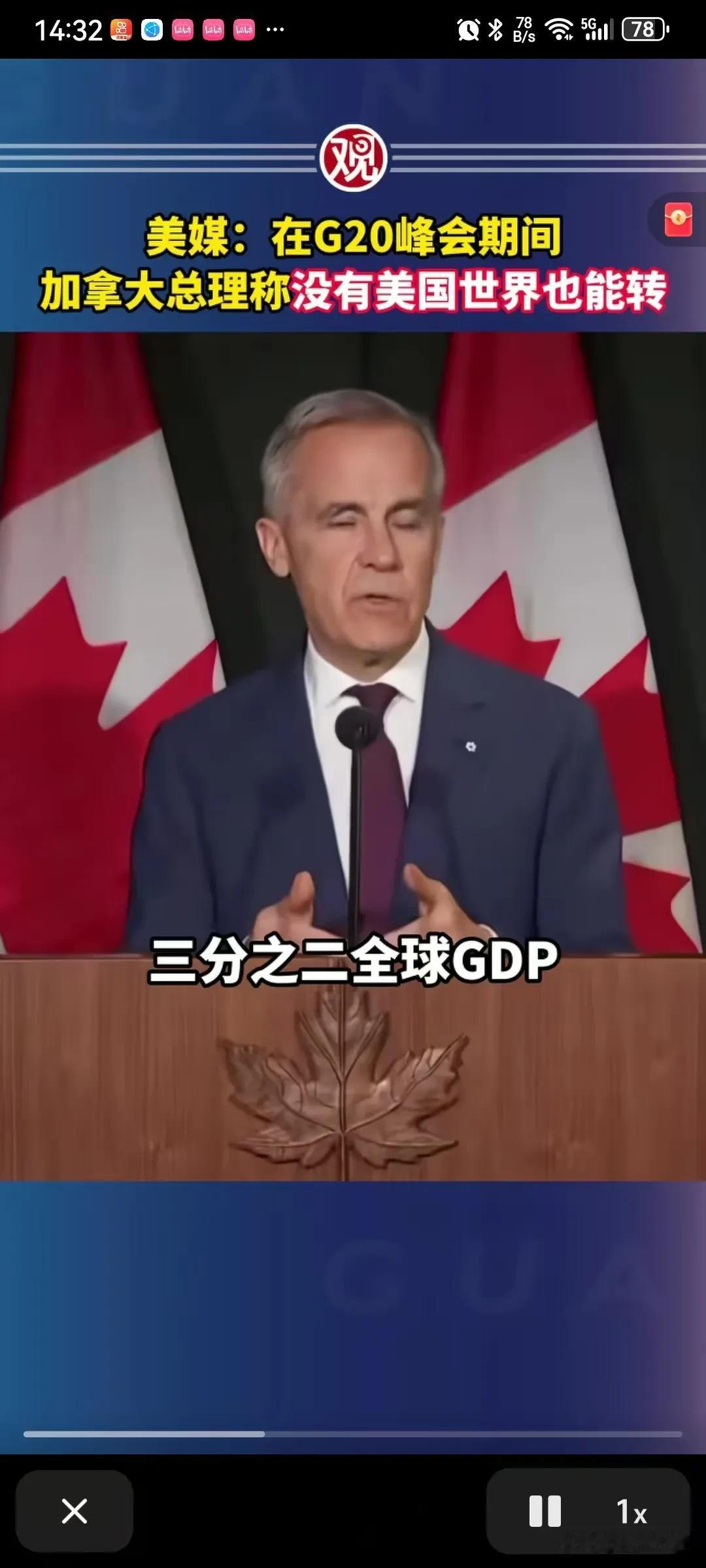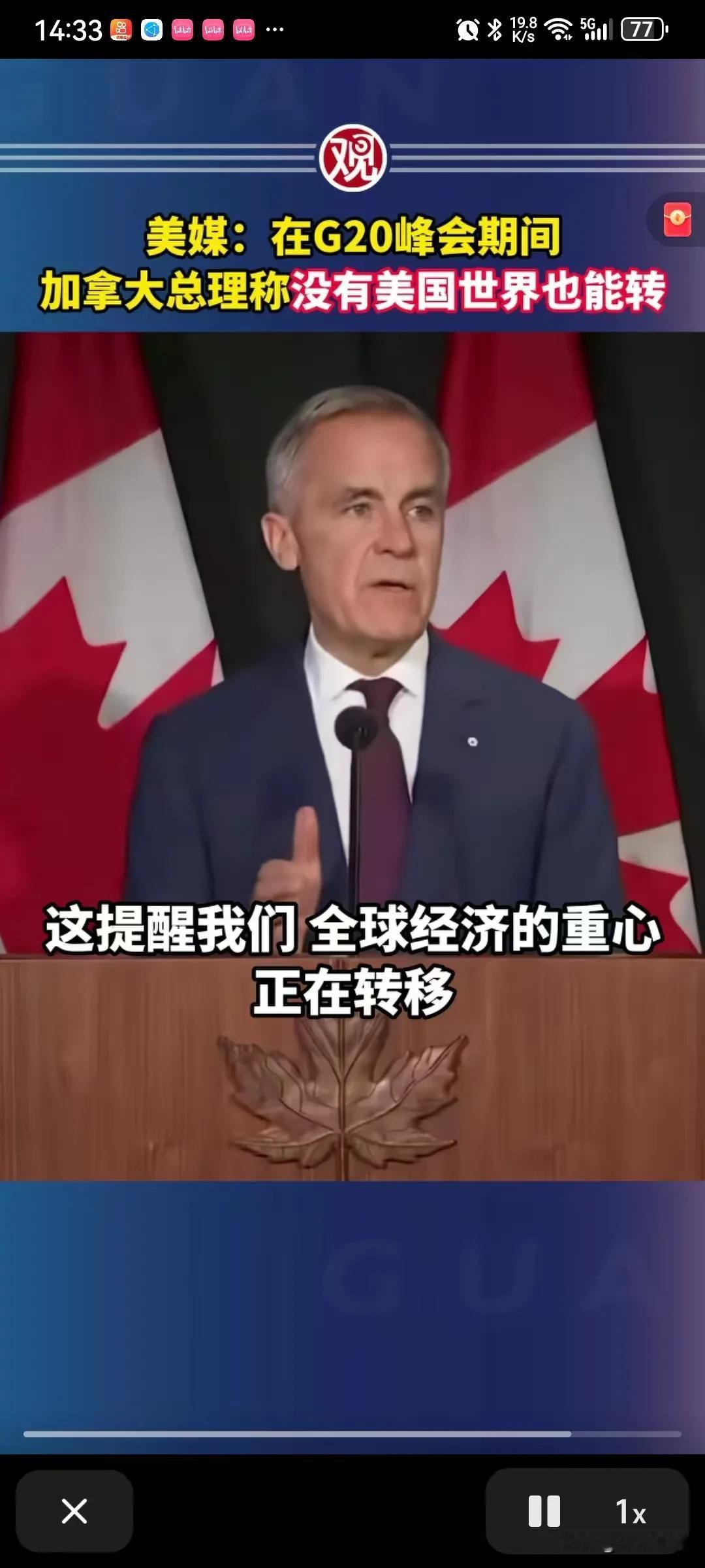 加拿大总理挺硬气的,在G20峰会上称没有美国,世界也能用转!加拿大总理说今年的G20齐聚了代表世界四分之三的人口,三分之二的全球GDP以及世界四分之三的贸易额的国家,这是在美国没有正式出席的情况下达成的,所以这提醒大家,全球经济的重心正在转移! 这话确实硬气,值得点赞,不过要一直硬气才对,不要川普等下一招手,你又屁颠屁颠地跑去承认错误了!以加拿大的德性,只要川普在社交媒体发一篇文章威胁一下,或者召唤一下,加拿大就退了,嘴巴再硬也没有用,毕竟你平时就太依赖美国,本来中国可以帮你减少对美国的依赖程度,结果加拿大却偏偏要跟着美国对我们加关税,那我们只能给火上浇油了,让你更依赖美国市场!