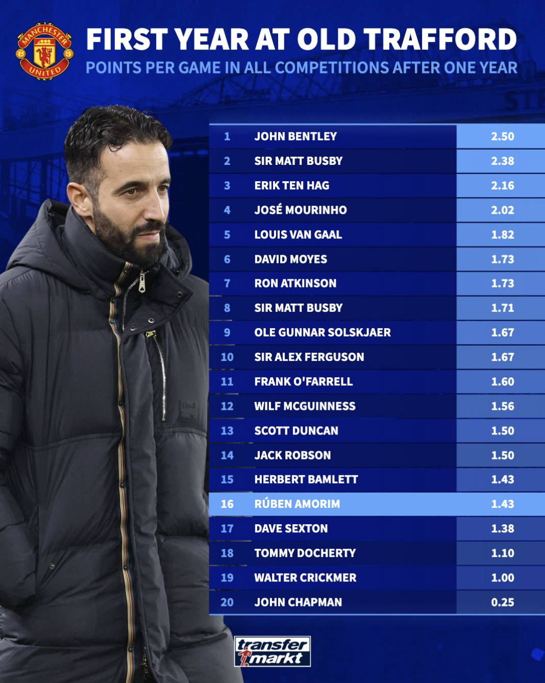 约翰-本特利以场均2.5分排名第一;传奇主帅弗格森以1.67分排名第十。上任主帅滕哈格以2.16分排名第三,而现任主帅阿莫林以1.43分排第十六。