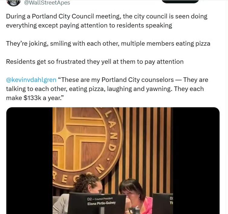 在波特兰市议会会议上,市议员们除了没有认真听居民发言之外,什么都在做:他们在互相聊天、开玩笑、对彼此微笑,好几个议员还在吃披萨。 居民气得直接对他们大喊,要求他们认真听! “这些就是波特兰市议员——他们在互相聊天、吃披萨、哈哈大笑、打哈欠。他们每人年薪13.3万美元。”