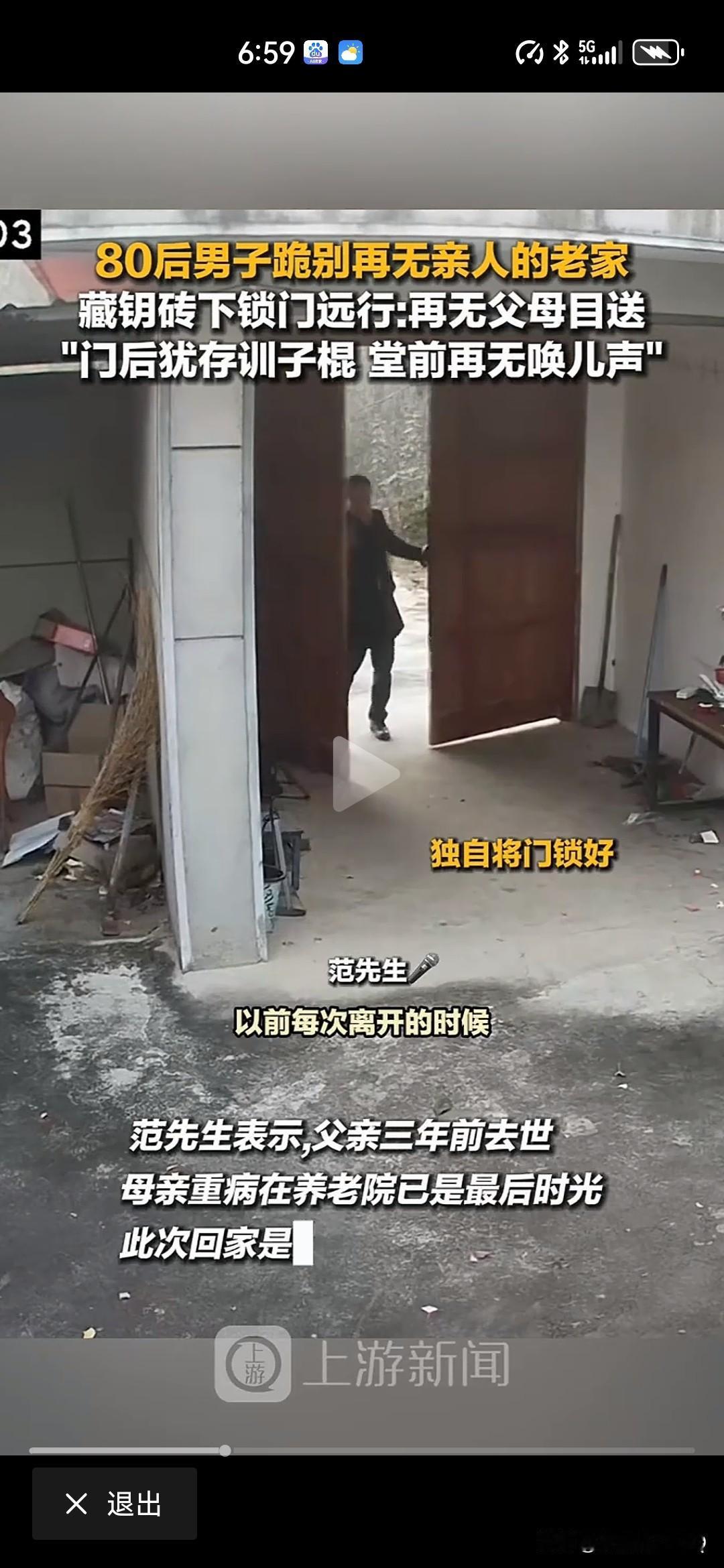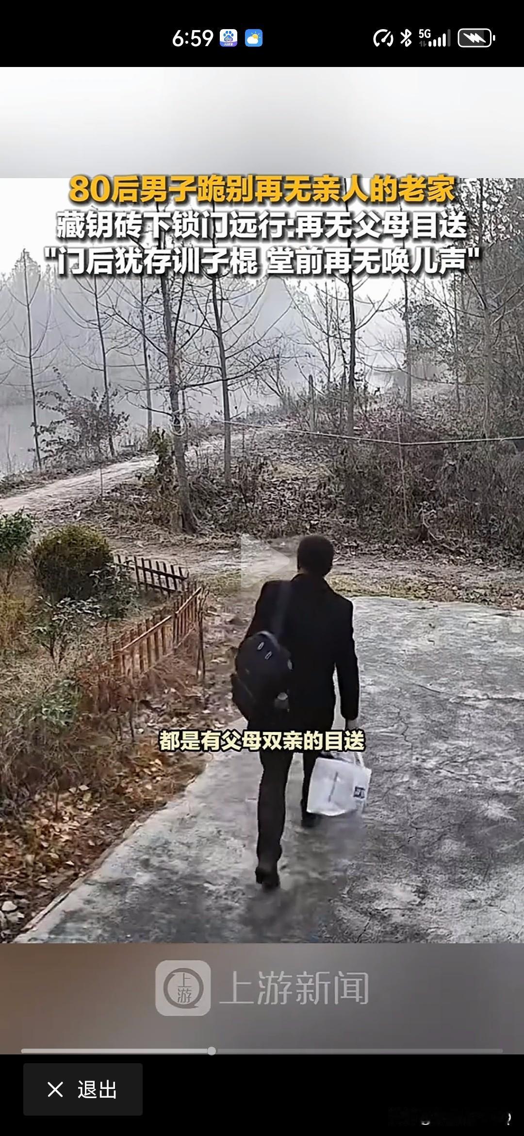 你有多久没回老家看看亲人了80后男子跪别再无亲人的老家!八零后这一代人基本是独生子女,父母离世后,没有结婚的也就是只剩一人,这个男子回到农村的家,再也不见父母亲了,偌大的一个家空荡荡的,再也听不到唤儿声,外出谋生,把大门锁上,对着儿时熟识而又陌生的家,跪拜三下才离去,他的身影是一个时代的踪影!