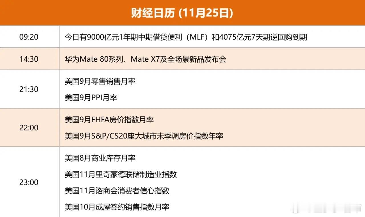 11.25股市早知道:1、外盘汇总:纳指大涨,如图一。 2、交易提示:如图二。 3、财经日历:如图三。 4、三大指数:1)大盘:3885之下,暂观望2)创指:3055之下,暂观望3)科创50:向上转折 5、重要新闻:1)工信部发布关于开展国家新兴产业发展示范基地创建活动的通知;2)中央空管办加强规范低空管理系统建设。 6、市场动态:1)华泰证券:港股正在进入布局区;2)上海市网信办开展“AI滥用”专项执法工作;3)黑龙江:到2027年力争全省新型储能装机规模达到600万千瓦以上;4)《上海市全面深化药品医疗器械监管改革促进医药产业高质量发展的若干措施》印发。 7、公司公告:1)工业富联:公司未向市场下调第四季度利润目标;2)中际旭创:董事、常务副总裁王晓东8月27日-11月24日累计减持70.86万股,减持均价414.24元/股;3)东方海洋:股东国元基金拟减持不超3%股份;4)星辉娱乐:股东拟合计减持不超2.90%公司股份;5)金杯汽车:与京东签订战略框架协议,成为京东汽车大客户业务供应商;6)龙蟠科技:与楚能新能源签署补充协议二,合同总销售金额超450亿元;7)无线传媒:股东拟合计减持不超4.70%股份。(关注点赞+评论,陪你一起到牛市)